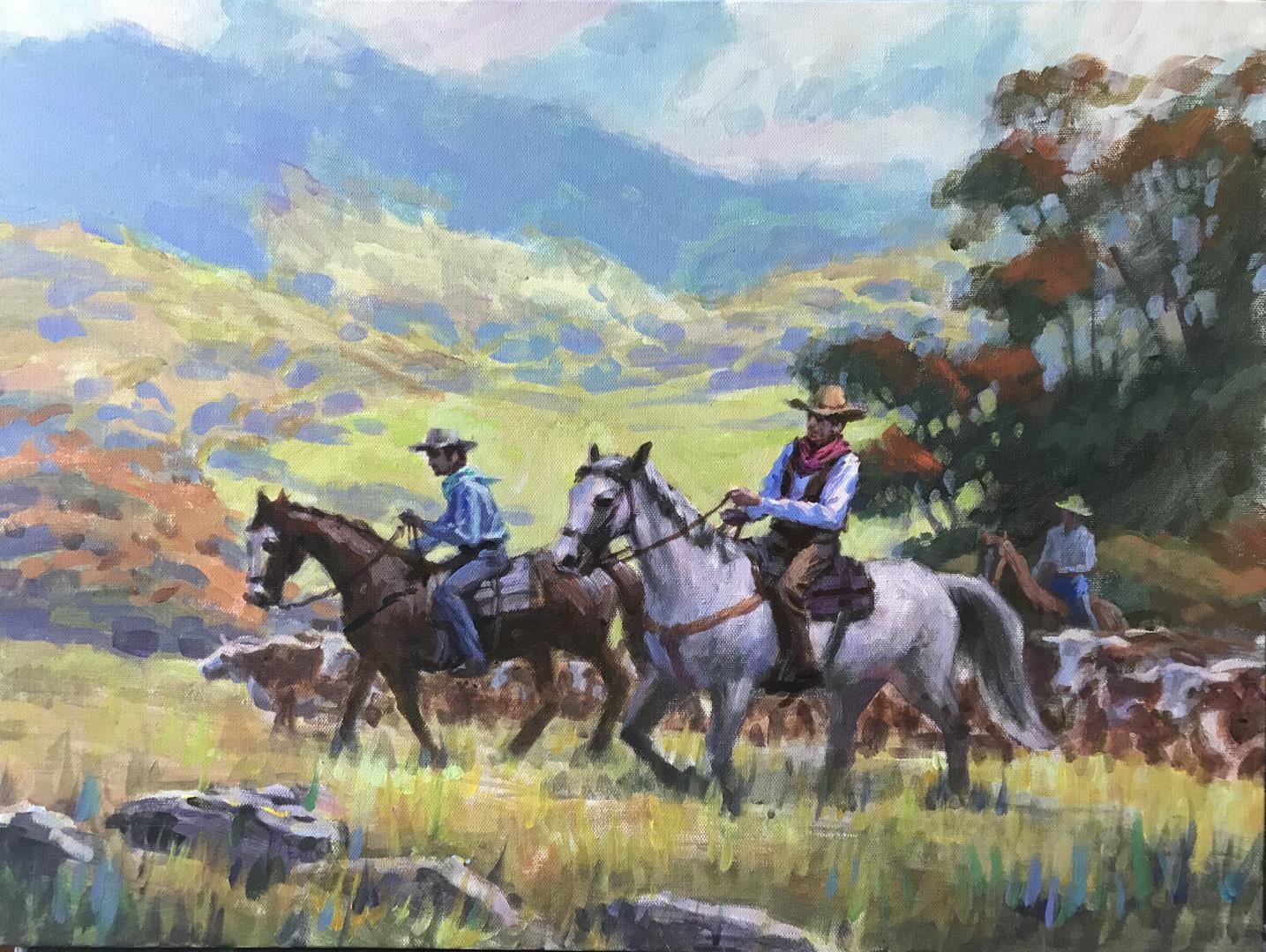 Cowboys move the herd from their high country grazing area. An original 18x24" acrylic on stretched canvas by Richard Ho. w/COA.