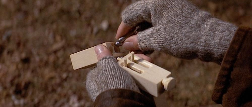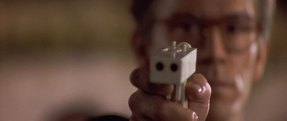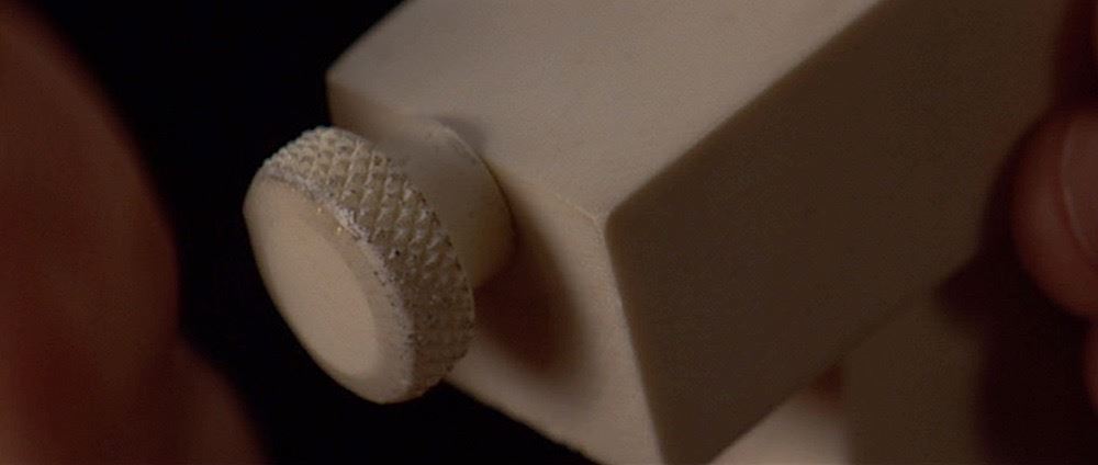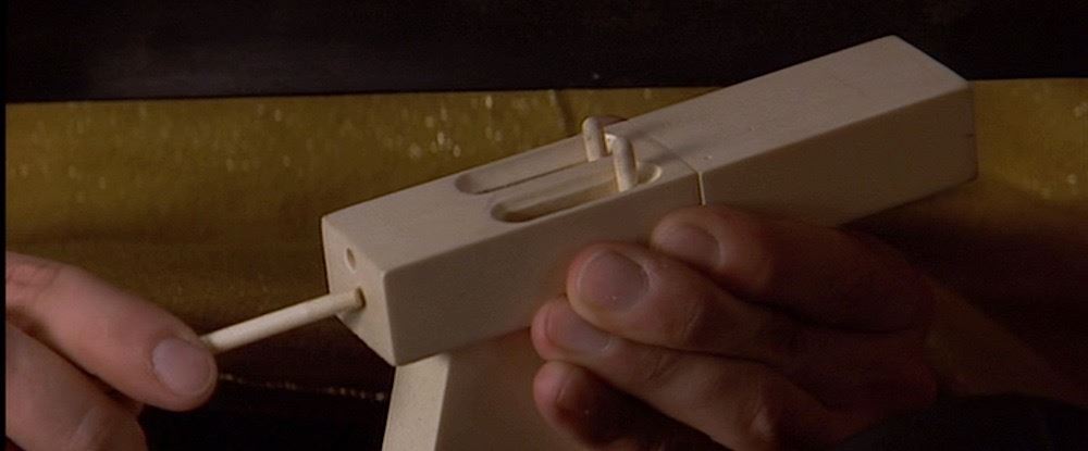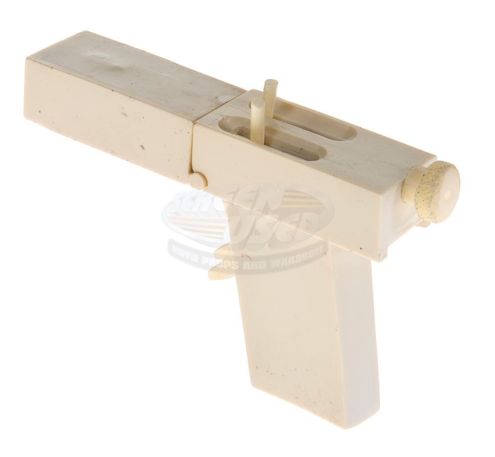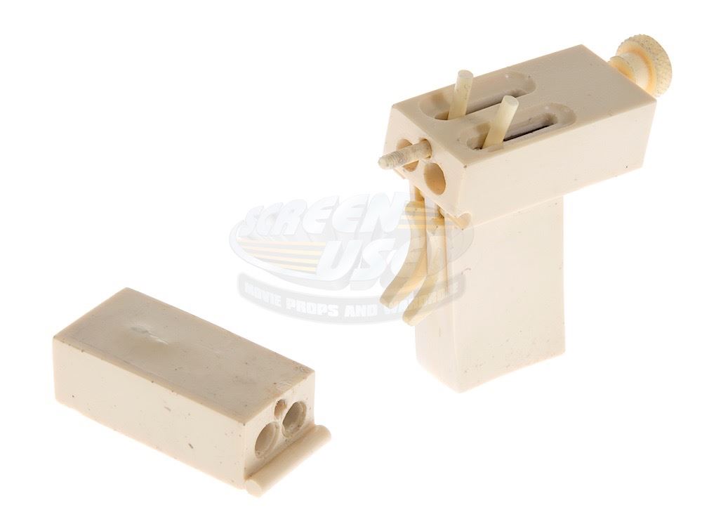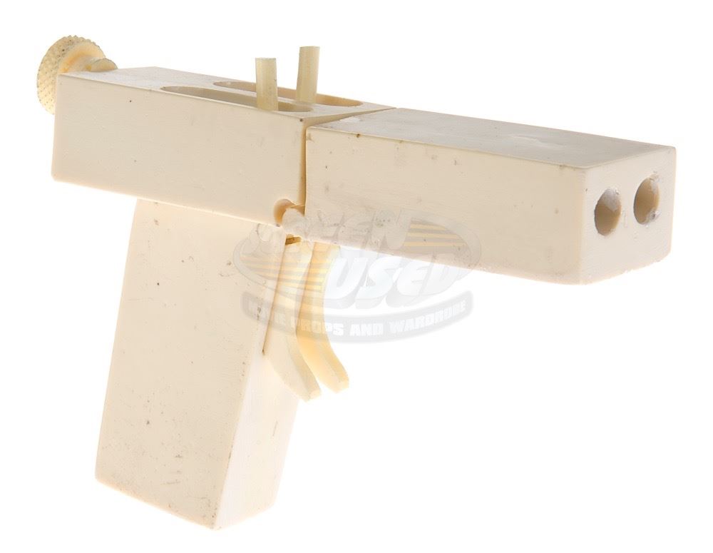 (Columbia Pictures, 1993) This prop improvised gun was custom-made by the production for use by John Malkovich as "Mitch Leary" in his attempt to assassinate the President. The gun is constructed entirely of resin and features two spring-loaded sliders along the top of the chamber. It was designed and built by weapons technician Frank Rousseau, and was designed to be (and still can be) completely broken down into its component parts consisting of two connecting barrel pieces, screw rod and pistol grip. The gun has minor wear from use and measures 6" x 4" x 1.25".