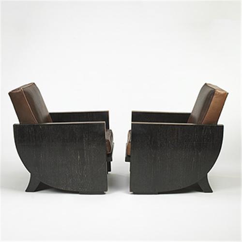 In the Manner of Jacques-Emile Ruhlmann lounge chairs, pair France, c. 1920 oak, leather 23"w x 30"d x 31"h