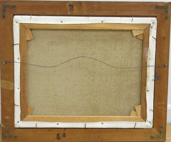Oil on canvas. Framed. Approx. 16" H x 20" W image, 20 1/2" H x 24" W framed. From a warehouse collection in Newark, NJ. No guarantee of provenance or authenticity. Small dent in canvas.