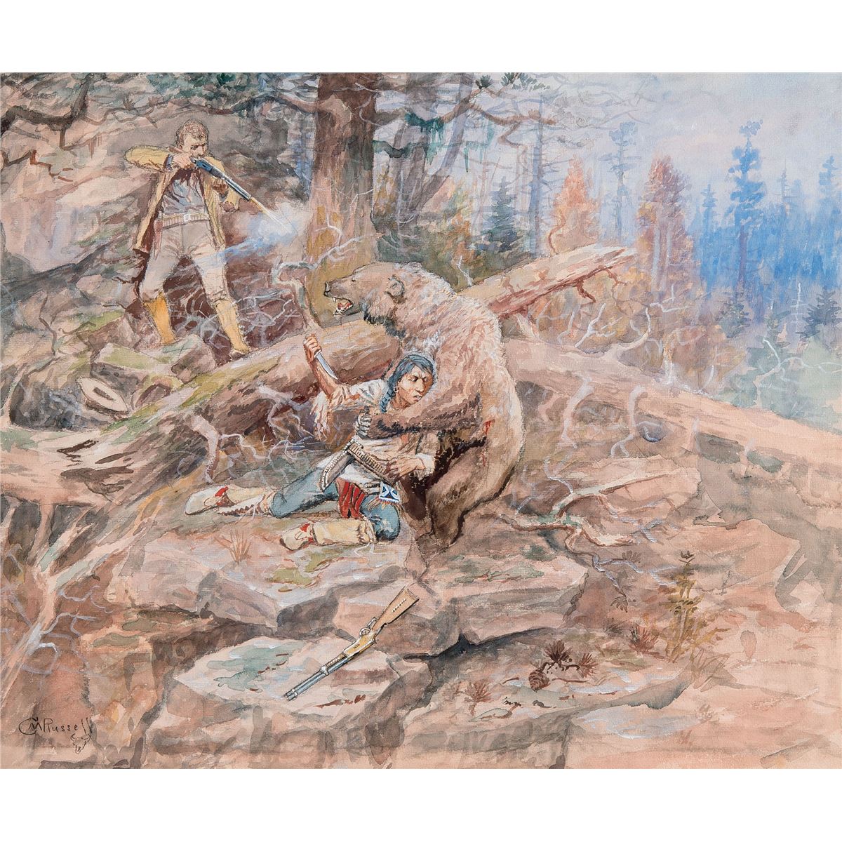From a label, verso: Many years ago, Mr. Frank N. Smith, probably in the early 1890Õs, was manager of the old silver smelter, located near the Giant Spring in Great Falls, Montana. The Smiths were good friends of both Charlie and Nancy Russell during their years spent in Great Falls and sometime during that period acquired the painting. Mrs. Atwater and Mrs. Sanders remember this picture as always having been a part of the family, ever since they were old enough to remember anything. The ÒBearÓ picture was always thereÑfrom Great Falls to Salt Lake City to Helena and East Helena and finally, to Spokane. One of the alternate titles of In the Nick of Time is A Tight Place. While both titles suit the painting and the action, A Tight Place neatly describes this tightly packed composition. Russell leaves no negative space here, nothing to rest the eye on or move the eye across. Your eye flicks from claws to knife to rock to fallen tree to fallen rifle to puff of smoke and back again. The sheer restlessness of looking at this work doubles and redoubles the tension in this split-second scene. The stage that Russell setsÑdeadfall and bouldersÑis a veritable minefield for missteps. The broken tree trunks and bare, gnarled branches seem to suggest that death is near, looking on, waiting to take the Indian or the bearÑor both.