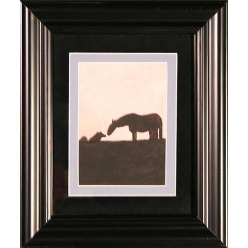 Margaret L. Neill?s Original watercolor painting entitled ?In the Pasture? is a charming scene depicting a horse along the horizon. The horse and dog that it is greeting were painted in total silhouette against the soft lavender horizon. The high contrast between the black silhouettes and the pale background creates a dramatic evening mood. The artist signed and dated the back of the piece and it reads, ?Margaret L. Neill, Dec. 4 1936, No. 19.? The painting has been double mounted in a light violet lower mat and black top mat adding a secondary level of contrast to the piece along with the black rolled wood frame. The unique matting and framing presentation of this piece was individually selected and created by Le Chateau?s renowned master framer, Jeanette Shoenrock, and bears her signature on the back. Including the frame this piece measures 11 ½? x 13 ¼? and would be a lovely and affordable addition to any collection, or children?s room.