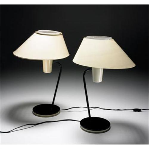 12 w x 12.75 d x 17 h inches<BR><BR>Condition: Subtle bends to exterior circumference of shades with spot losses in the enameled finish to each. One missing edging to bottom edge of shade. Significant dents to base of one. Overall fine vintage condition.
