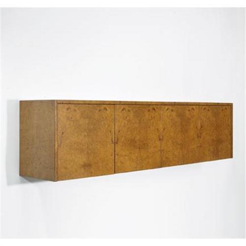 Four doors conceal storage with four adjustable shelves.<BR><BR>Condition: Scattered, light ware to walnut throughout with mild water staining to the top. Doors are slightly loose, and hardware could benefit from tightening. Overall good vintage condition.