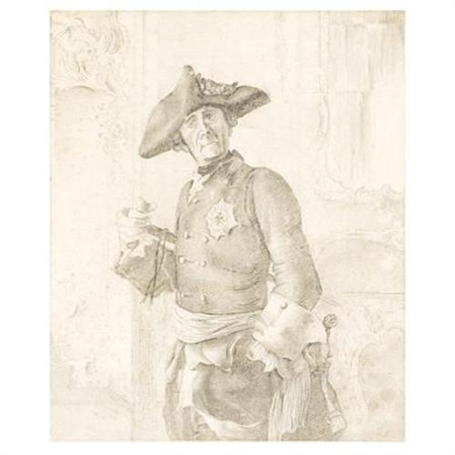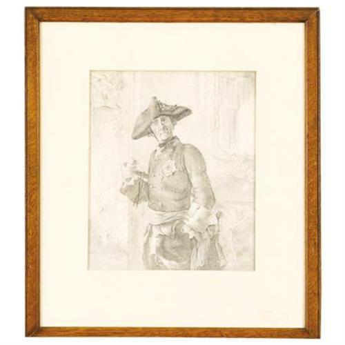 <B>In the style of ADOLF VON MENZEL (Polish/German, 1815-1905)</B></I><BR><I>The Proud Officer</B></I><BR>Pencil on paper<BR>9-3/4 x 8-1/4 inches (24.8 x 21.0 cm)<BR> <B>Condition Report:</B> Heavy foxing. Matted and framed, not examined out of frame.<BR><BR><b>Shipping:</b> Framed - without Glass, Small (<a target="_blank" href="http://www.heritageauctions.com/common/shipping.php">view shipping information</a>)