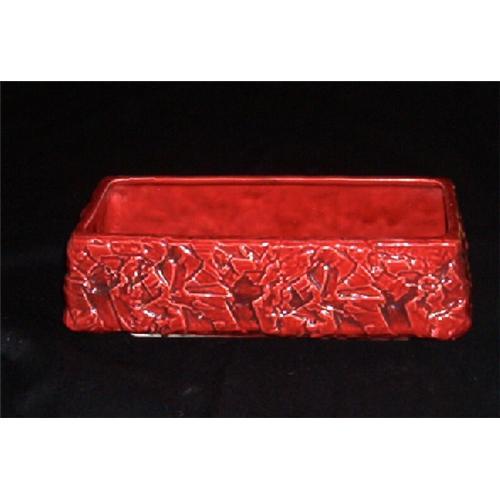 Featuring a highly glossed dark red, beautifully decorated, Inarco Planter, which is in mint condition. The outside looks like a basket weave design. This Inarco plater is stamped on the bottom of the base in black letters: INARCO-E-2462 along with a black oval design. This planter measures: 2 3/4 inches tall; 8 1/4 inches long by 3 3/4 inches wide; depth measures 2 1/4 inches. A very pretty Inarco Planter and highly glossed.