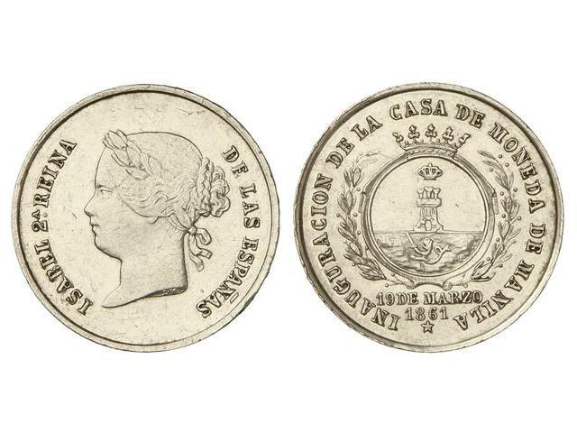 Inauguración de la Casa de Moneda de Manila. - 19 Marzo 1861. - MANILA. - Anv.: Busto de Isabel II a izquierda. Rev.: Escudo de Manila. AR. Ø 22 mm. MBC+. - -