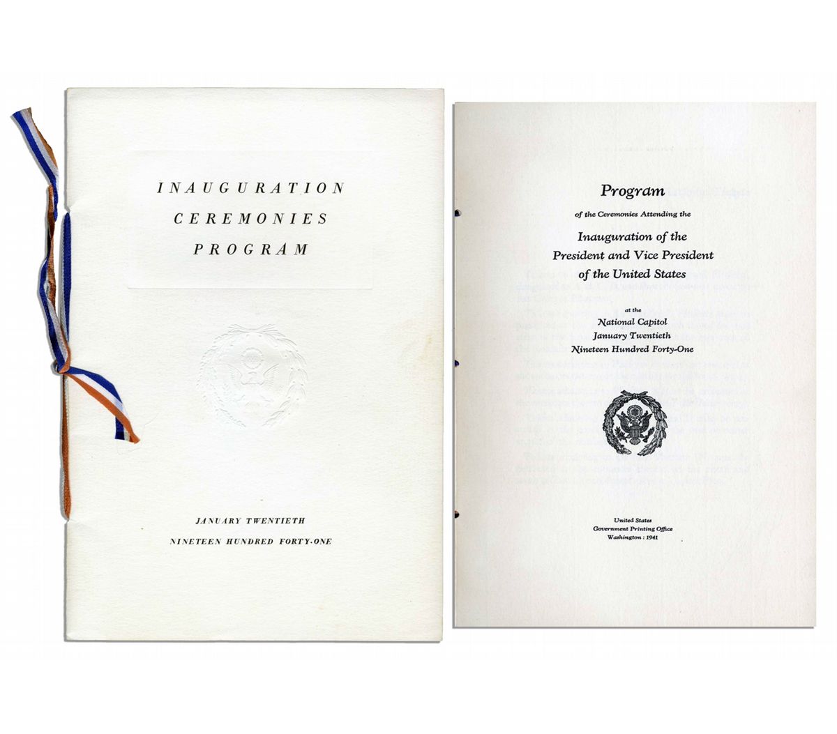 Inauguration Ceremonies Program dated 20 January 1941 for the swearing in of President Franklin Roosevelt and Vice President Henry Wallace. This, FDR's third inaugural, was the only time a U.S. President was inaugurated for a third term. The 16 page 6'' x 9'' program, embossed on the front cover with the Great Seal and bound with red, white and blue ribbon, shows minor toning, else near fine. Its original envelope, marked number 2745 for Platform B, shows significant dampstaining, else very good.
