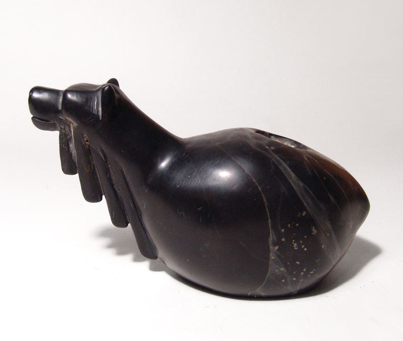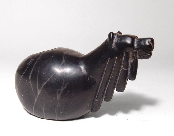 A nice Inca stone Canopa in the form of a alpaca, Peru, c. AD 1300 - 1500, nicely carved in a banded black stone, the back hollowed and still retains the animal fat. A nice example of an offering used in hopes of a better harvest or healthy animals. L: 6 in (15.2 cm); H: 4 in (10.2 cm). Ex Florida private collection.