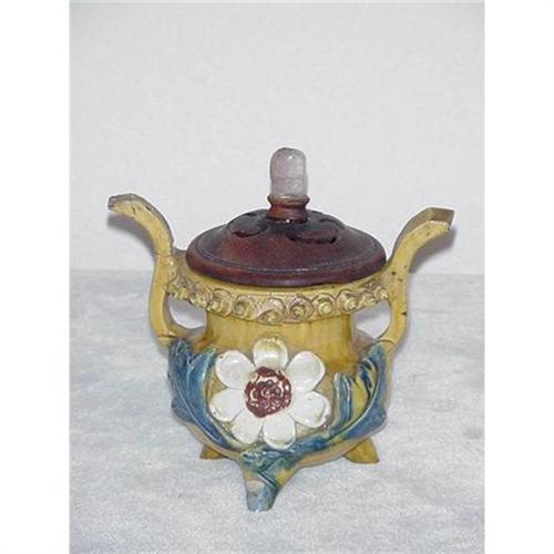 An oriental incense burner or potpourri, 7" tall to top of finial,6 1/4" handle to handle. The glazed pottery body is decorated with relief flower and leaves, the wood top is piereced and the finial is rose quartz. The handle on the piece has been broken and glued back on as shown otherwise the condition is good the finial on the lid has also be glued on, it is an interesting ugly/beautiful piece.