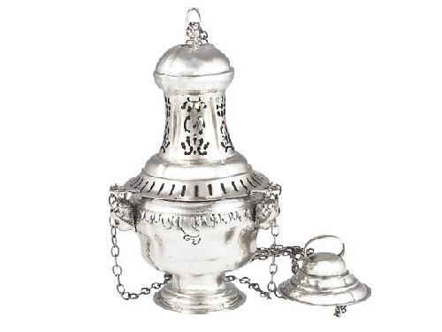 Silver, 604 g. Vase form, liturgical dish hanging on three chins. Round, profiled base, braizer with chased, rococo decoration and three cast angel heads. The replaced cover is pierced. Marked: Kassa, circa 1770, Andreas Grimm. Koszeghy: 849, 884. Length: 78 cm