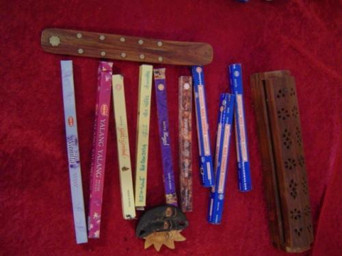 12" Incense burn/storage Coffin Box, incense boat and nine assorted 10 gram boxes of East Indian Incesnse. Indonesian carved sun/moon.