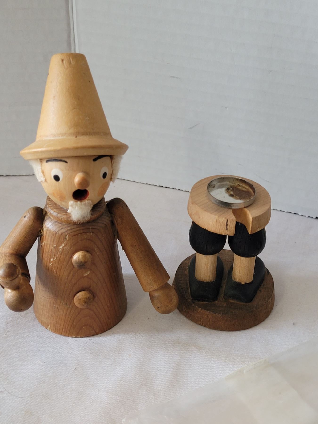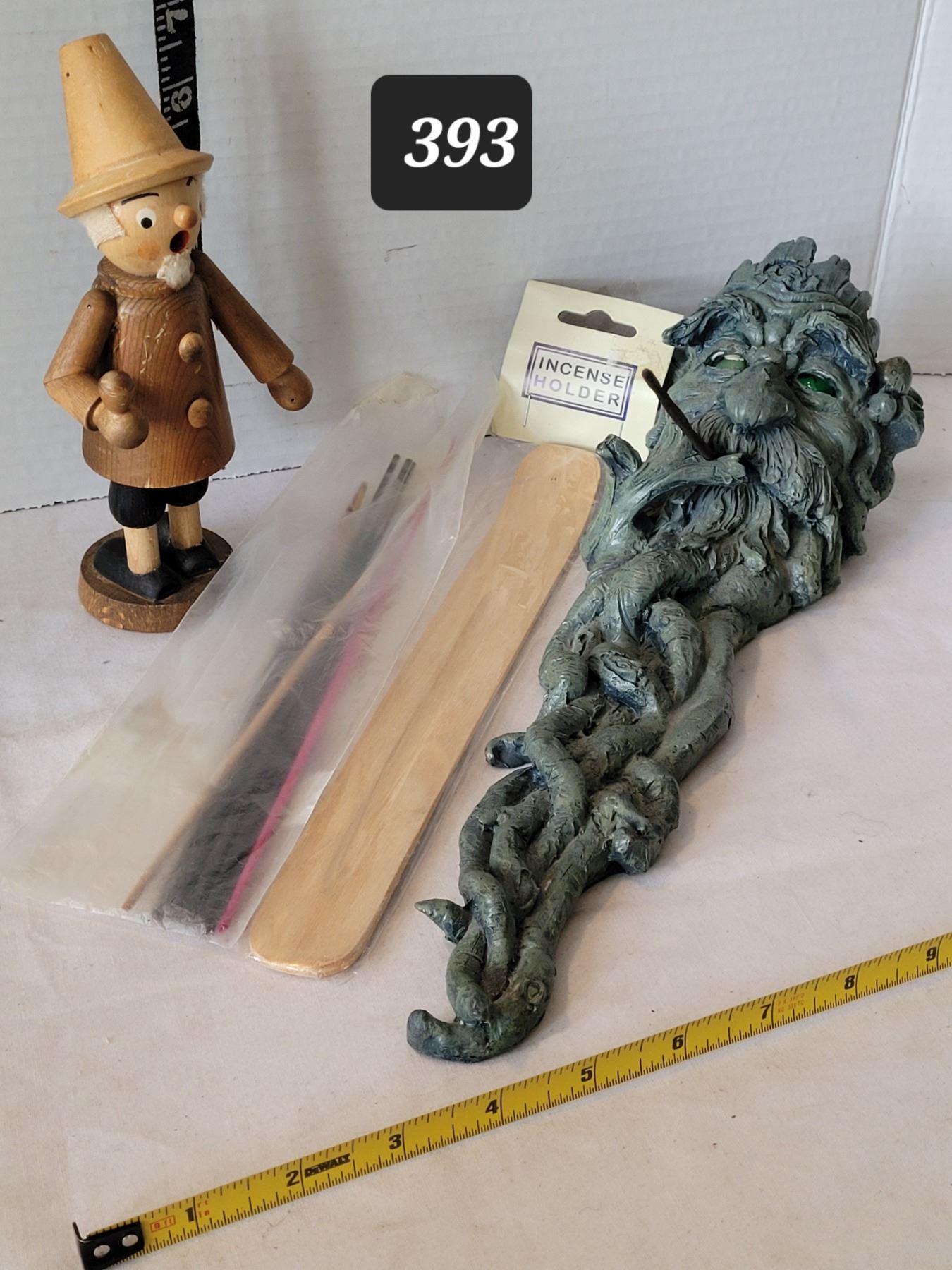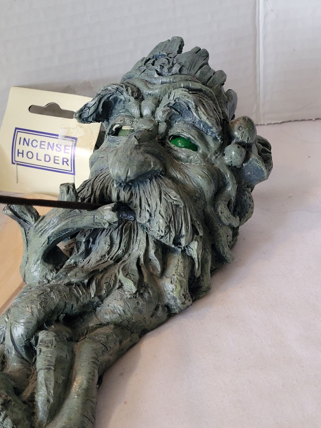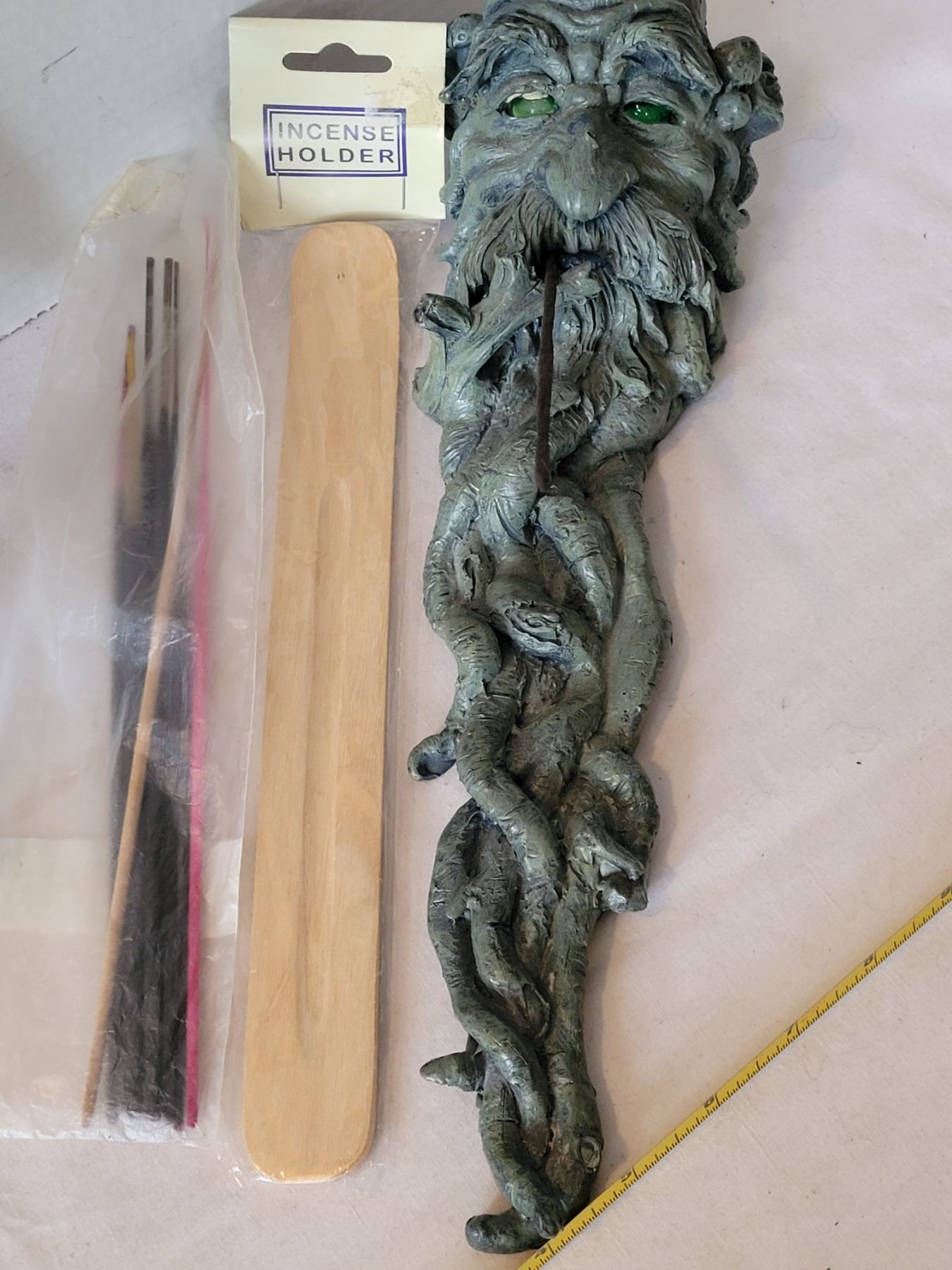 Incense burners & sticks. Green man stick burner & vintage wooden Norwegian cone burner.