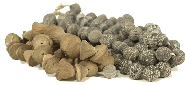 Early/Mid 1900s, Four strands of handmade tradebeads, each bead with its own unique original design, plus a 5th strand of bell-shaped beads, also with each bead having its own original design. 4 @ 28", 1 @ 36"