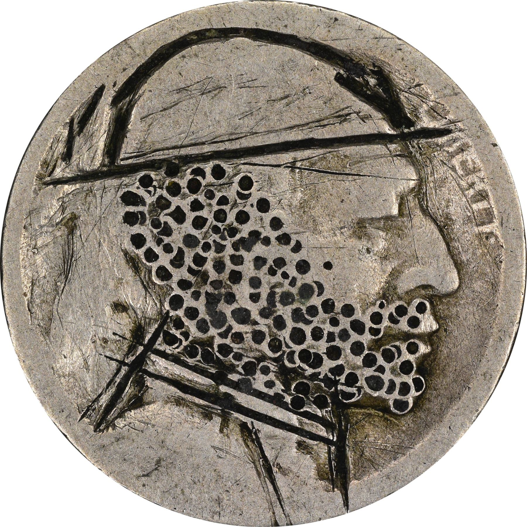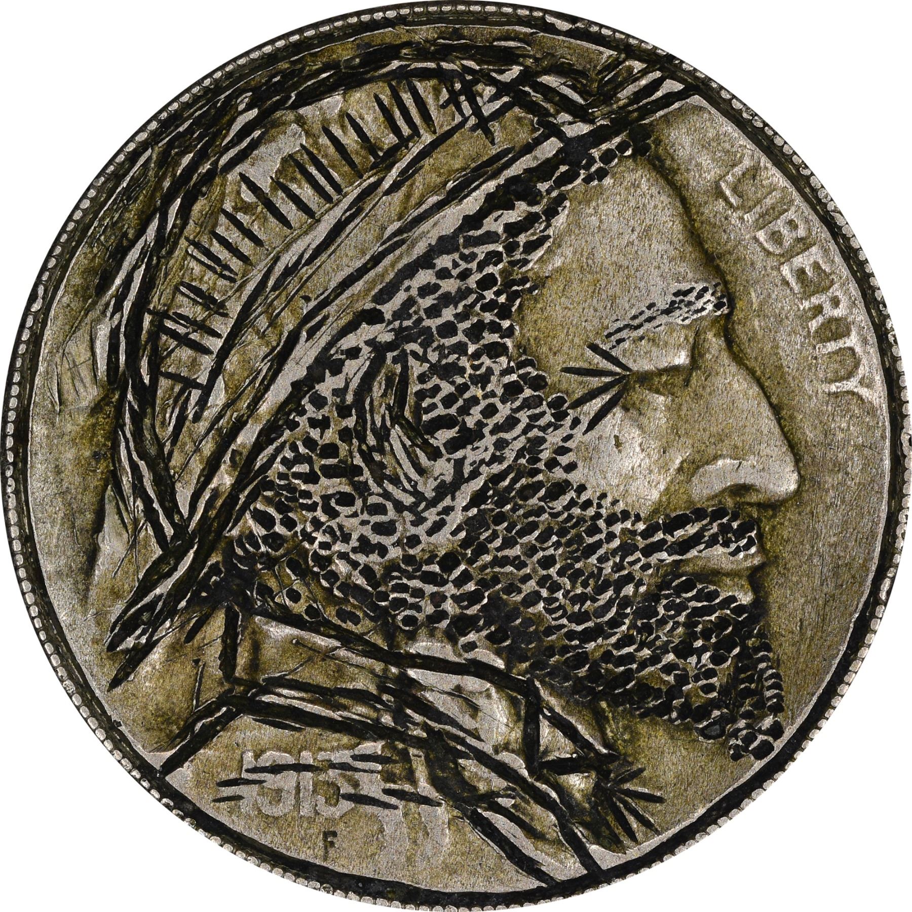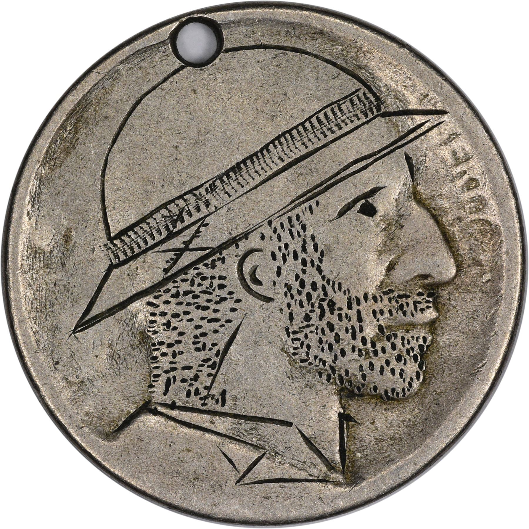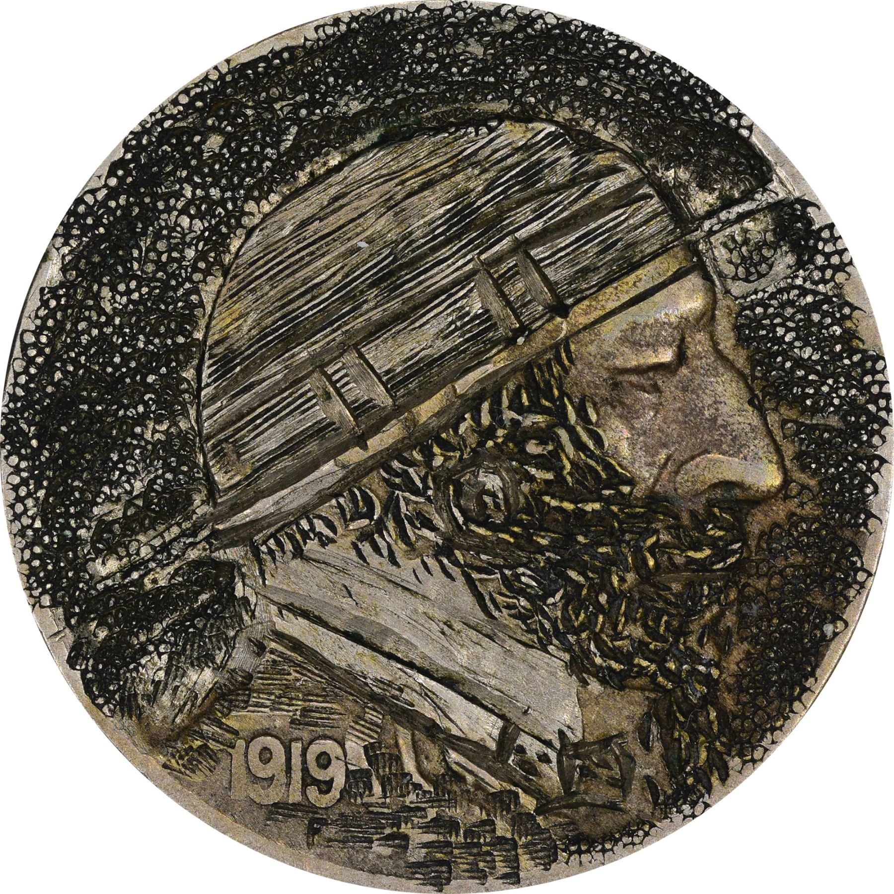 Description: A variety of carvings that include one that has a hole punched in it, and a reverse carving on a hobo with a high collar. (Total: 8 coins)