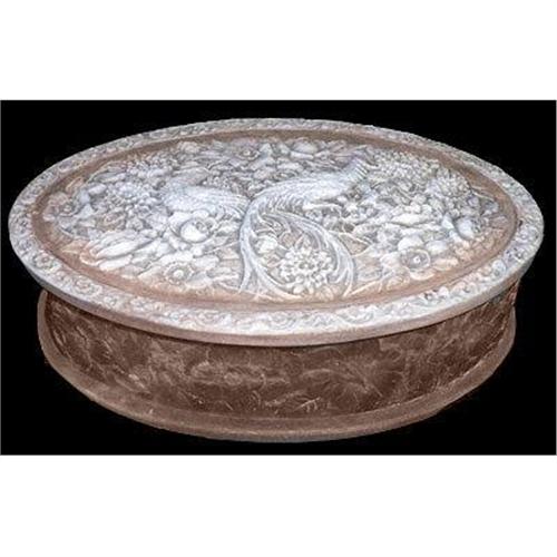 This vintage Incolay Studios Jewelry Box is beautifully handcrafted in lovely blue Incolay Tourmaline Stone. The top of the box is sculpted in bas-relief with a central design of two Birds of Paradise entwined in a field of flowers. The side of this oval box is surrounded with a 2 1/2" frieze of flowers. It measures 11" x 6" x 2.5", the inside is lined with black velvet, there are four velvet feet on the bottom. The box is piano hinged, and in excellent condition