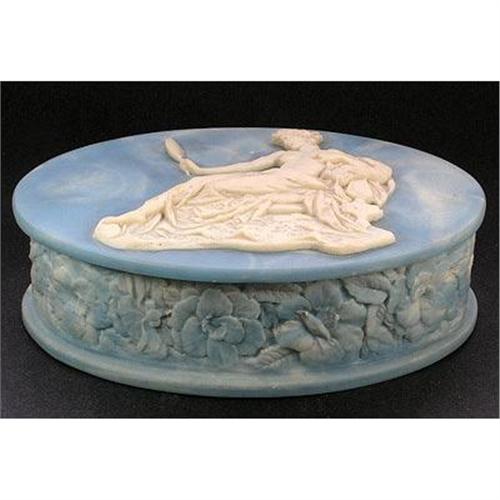 Incolay Studios produced this gorgeous jewelry box, circa 1960s-1970s in blue Incolay stone. The lid is adorned in off white bas-relief with a Classic Lady reclining in a chaisse lounge while gazing into her hand mirror. An array of flowers and assorted flora decorate the sides. Felt lined, piano hinged, oval shaped, measuring 10 1/4 inches long x 6 3/4 inches deep x 3 1/2 inches tall and is in excellent condition.