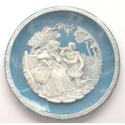The Love Sonnets of Shakespeare series of limited edition collector plates was sculpted by artist Roger Akers and hand crafted by Incolay Studios on Tourmaline Blue Stone. 'You Shall Shine More Bright' is the sixth and final plate in the series closed forever on October 31, 1989. The diameter of the plate is 9.5in. and it is in excellent condition with original box and Certificate of Ownership. Plate No. 2874A - Bradex No. 84-I31-6.6
