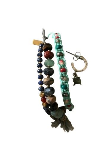 Gabrielle's (Victoria Moroles) screen worn, double beaded bracelet with muted blue/green/grey/red color scheme, a turquoise beaded macrame bracelet and one silver plated hoop hearing with a green stone dangling.