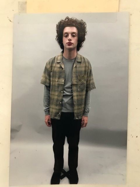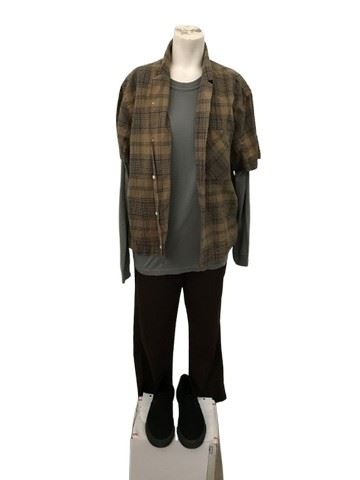 Ruby's (Thomas Barbusca) screen worn, grey, "Comfort Colors" long sleeve t shirt (s), brown and black plaid, "H&M" short sleeve button down shirt (s), and "Dickies", maroon work pants (29x30). Includes studio wardrobe tag.
