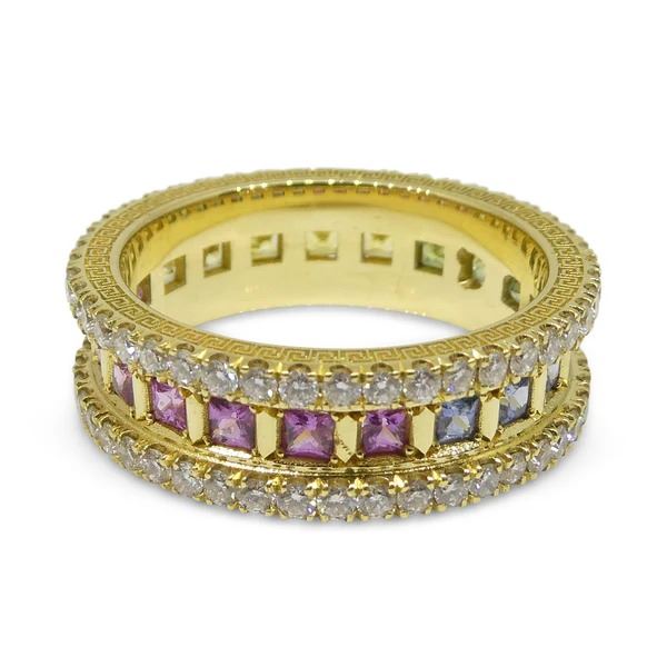 Unique 1.47 Cttw Rainbow-colored Sapphires are square brilliant cuts measuring approximately 2.20 x 2.20 x 1.50 mm. These 21 Sapphires are set in 18k Yellow Gold and are accented with 90 diamond accent stones. Ring Size: 10. Total Diamond Weight: 1.75 Ct. Sapphire Origin: Sri Lanka. Total Weight of Item: 11.55g.
