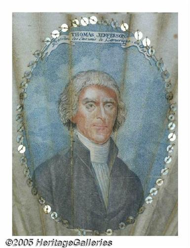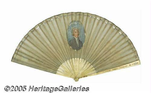 <B>Incredible 1801-dated Thomas Jefferson Inaugural Fan</B></I> One of the very best presidential/political display pieces we have ever handled! Full-color portrait of Jefferson in his prime, with "President of the United States of America in 1801" (in French) below. Like all quality manufactured goods of this era, this fan was manufactured in Europe for the American market. Jefferson was still a very popular figure in France, where he had long served as U.S. diplomatic representative, particularly because he was among the strongest American supporters of the French Revolution. This delicate fan is made of heavy paper with ornate openwork ivory stays. There is a silvered metal outer edge, inside which is sewn a line of tiny shiny sequins. A similar circle of sequins also surrounds Jefferson's portrait. Condition is very fine, with just a little bit of light, even, surface soiling radiating out from the stays in the lower portion, so even that it looks like natural shading (probably cleanable if one felt the need, but we certainly do not). Only one other example is known, ensconced in perhaps the finest private political collection. Truly a once-in-a-lifetime opportunity for the most discerning collector, at a valuation scarcely above that normally placed on the relatively available Jefferson Liverpool ceramic pitchers! 17" x 9.75" when displayed open. Lot:255