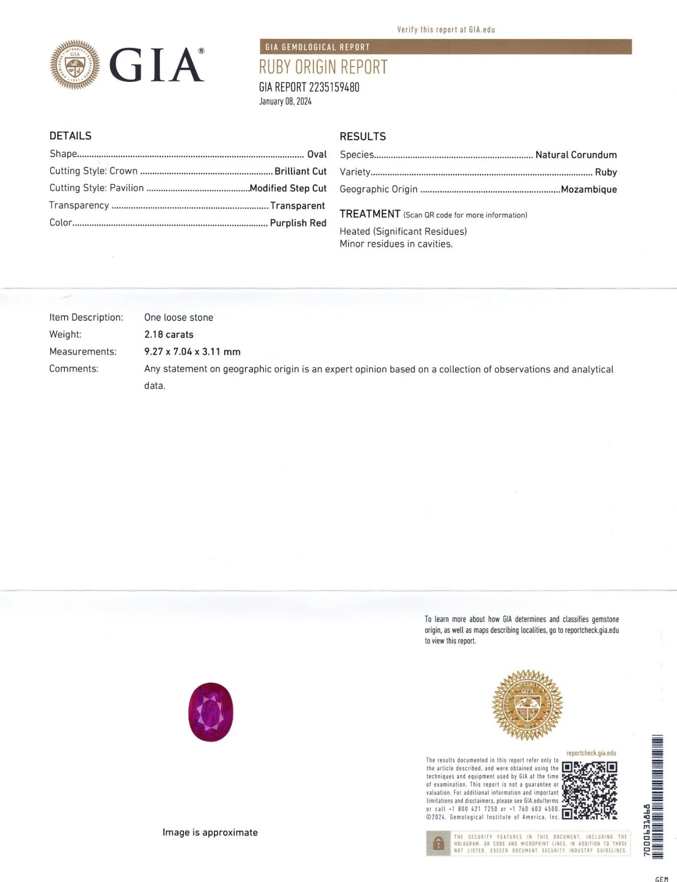 Breathtaking 2.18 Ct Purplish Red Ruby is an oval brilliant cut measuring 9.27 x 7.04 x 3.11 mm. Reveals an impressively strong saturation with a medium tone. This Ruby is beyond gorgeous! Origin: Mozambique. Treatment: Heat only. Please see the certification for additional information.