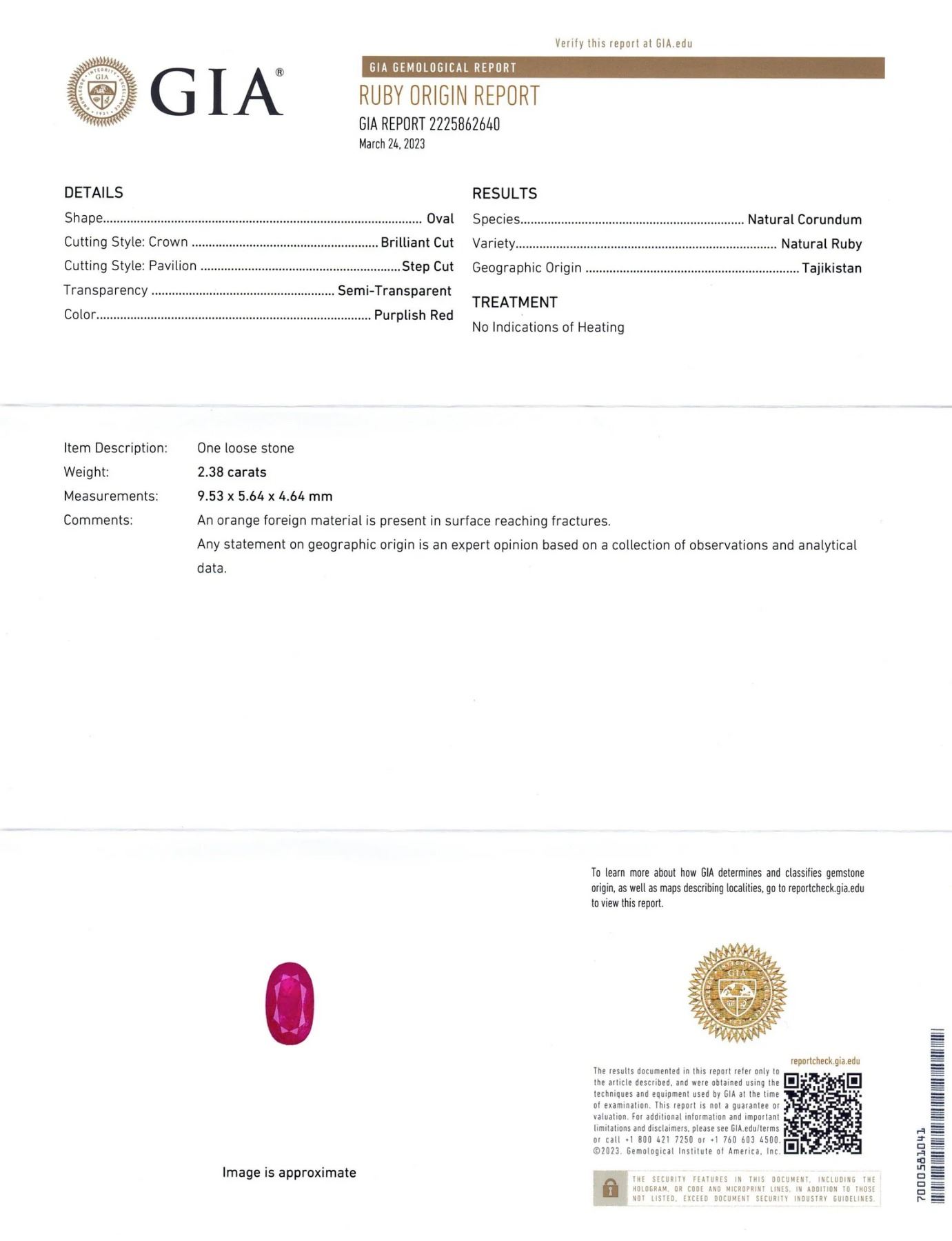 Breathtaking 2.38 Ct Purplish Red Ruby is an oval brilliant cut measuring 9.53 x 5.64 x 4.64 mm. Reveals a gorgeous hue with a medium dark tone and strong saturation. Ready to mount and be admired! Origin: Tajikistan. Treatment: None. Please see the certification for additional information.