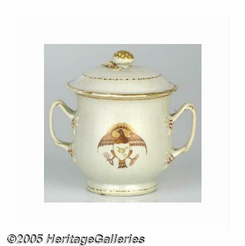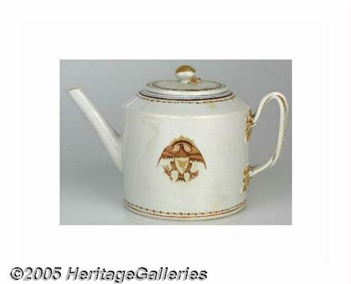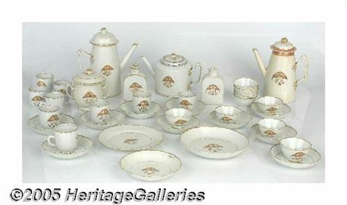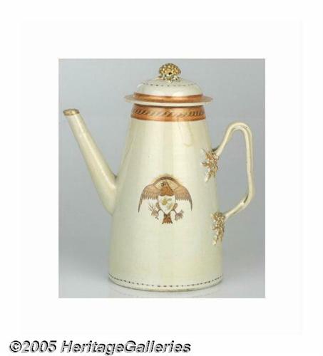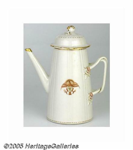 <B>Incredible Collection of 1790s Chinese Export Porcelain</B></I> Thirty-eight pieces of this highly collectable china, which have been in one collection since the early 1900s. The entire group was loaned to the Metropolitan Museum of Art for exhibition in the 1920s, and each has their accession information neatly lettered on the bottom of each piece. These Federal-style pieces, each with an American eagle, were part of a body of such designs crafted in China for the American market. They are prized both by porcelain collectors and for their "period" decorative appeal. When one sees such items on the market, they are almost invariably cups and/or saucers. But the "hollow pieces" are extremely rare, and this group contains a remarkable representation. Most pieces are in excellent condition, except as noted. All are unmolested, and the few minor imperfections could be easily addressed by any competent conservator of ceramics. The collection consists of: 1) 9.125" lidded coffee pot. This is one of only two pieces in the set that doesn't seem to be from the same service as the others. It is of a slightly different form than the other coffee pot, and has two additional wide decorative bands around the top and lid. Two chips on edge of lid, one crack by spout, and very light discoloration. 2) 9.625" lidded coffee pot in beautiful condition. 3) Massive 5.625" lidded tea pot. Couple very trivial fine hairlines on one side, and very slight discoloration. 4) 5.375" lidded, double-handled sugar bowl. 5) Two 5.375" lidded vinegar bottles, one of which seems to match the first coffee pot. 6) 8" bowl, 1.375" deep. One 1.5" crack in from edge. 7) 7.625" plate. 8) 6.25" shallow bowl. Two small pieces cleanly broken out at rim, and crudely glued back in place. One 1" hairline from rim. 9) Ten 5.5" saucers, all in beautiful condition. 10) Seven 2.625" cups with handles in beautiful condition. 11) Two more such cups, each with one trivial hairline. 12) Eight handle-less cups in beautiful condition. Each 3.375" in diameter and 1.75" tall. 13) Two more such cups, one with two trivial small hairlines, and one which was broken into several clean pieces and amateurishly glued back together (no porcelain material missing). The consignor toyed with separating these because of the extreme demand for the "hollow" pieces. However, in the final analysis it seemed to break up a collection which had been together so long. A tremendous opportunity for the serious dealer or collector of Chinese Export Porcelain. Lot:251