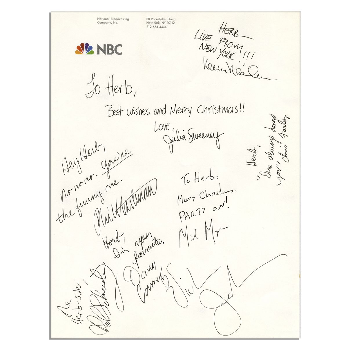 Rare collection of ''Saturday Night Live'' cast member signatures and inscriptions on NBC letterhead. With eight signatures in total from some of the show's most famous alumni. Each comedic actor signs and inscribes a personal note to ''Herb''. Inscriptions read, ''Hey Herb, No no no. You're the funny one. Phil Hartman''; ''Herb, I've always loved you. Chris Farley''; ''To Herb, Best wishes and Merry Christmas!! love, Julia Sweeney''; ''The Herb-ster, Rob Schneider''; ''Victoria Jackson''; ''Herb, I'm your favorite. Dana Carvey''; ''To Herb, Merry Christmas. Party On. Mike Myers''; ''Herb--Live from New York!!! Kevin Nealon''. Signatures on one sheet measuring 8.5'' x 11''. With a PSA/DNA COA. Fine condition.