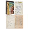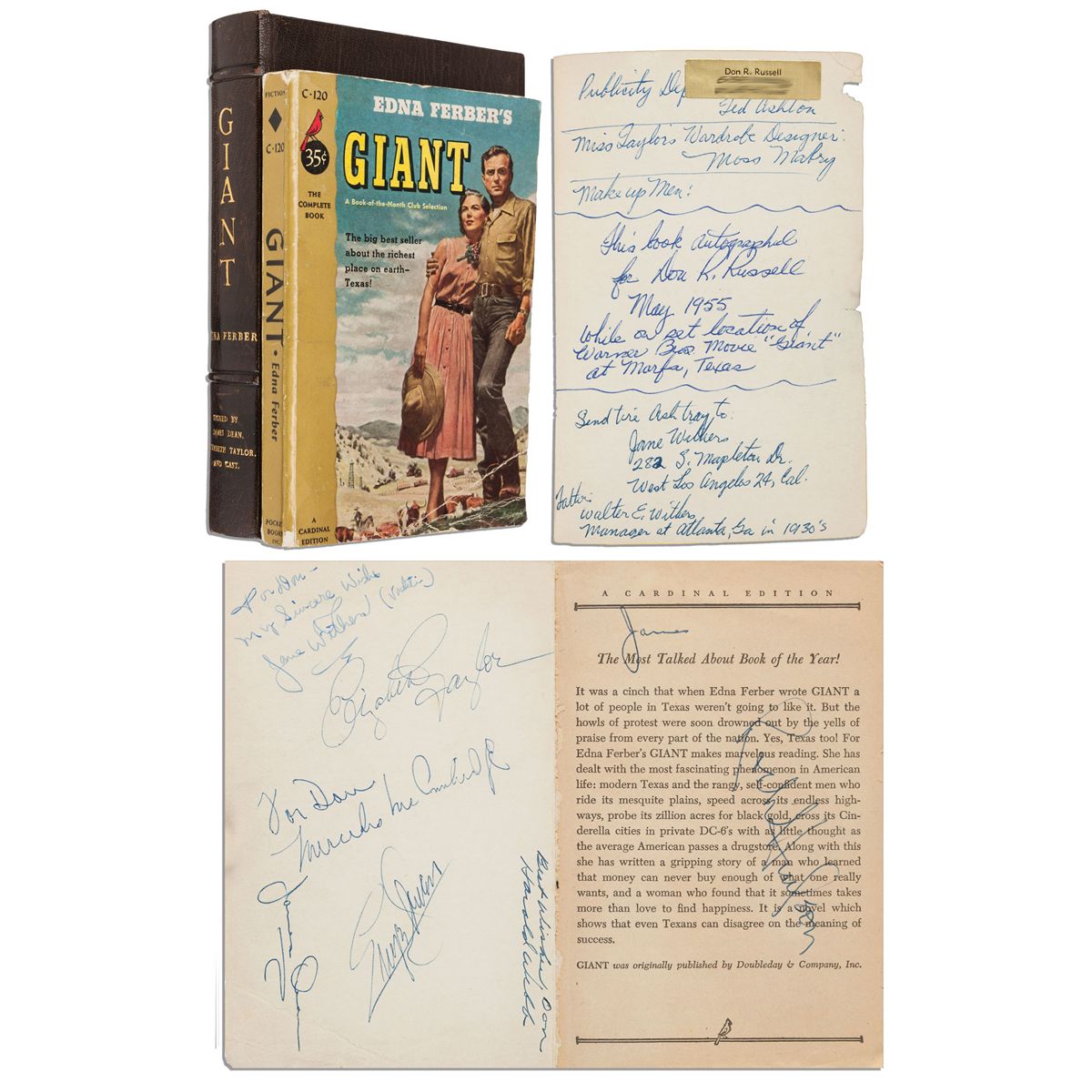 Signed copy of ''Giant'' by Edna Ferber, Pocket Books: New York: 1953. Mass market paperback is signed upon the inside of the pictorial front cover and fly-leaf by the stars of the film adaptation, ''James Dean'', ''Elizabeth Taylor'', ''Rock Hudson'', ''Jane Withers'', ''Mercedes McCambridge'' and by the director ''George Stevens'' and special effects designer ''Harold Webb''. Webb, Withers and McCambridge add a dedication in their hand. James Dean may have signed twice as ''James'' appears again above Rock Hudson's signature. Book runs 389pp. and measures 4.25'' x 6.25'', housed in a chocolate leather case with gilt lettering. First leaf is absent. Handwritten note and prior owner's sticker on rear inside cover. Creasing to covers and surface loss to rear cover. Very good condition.