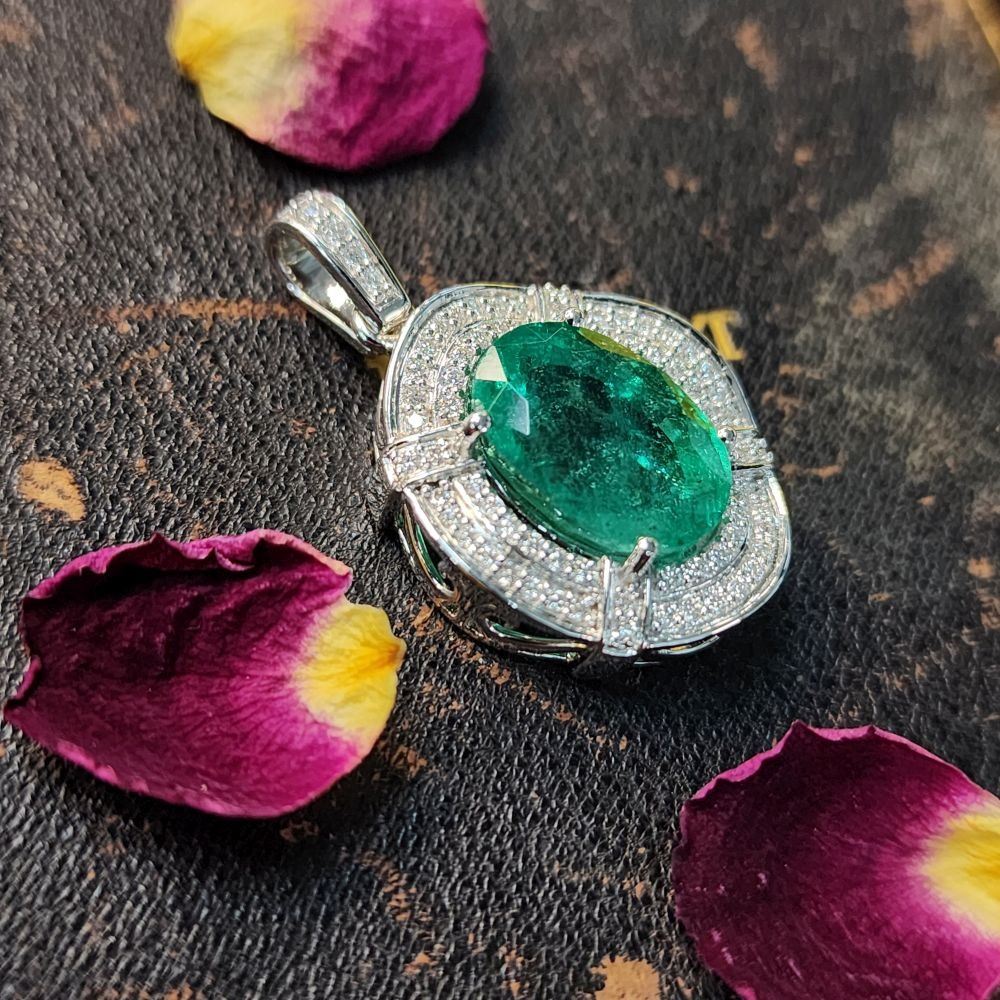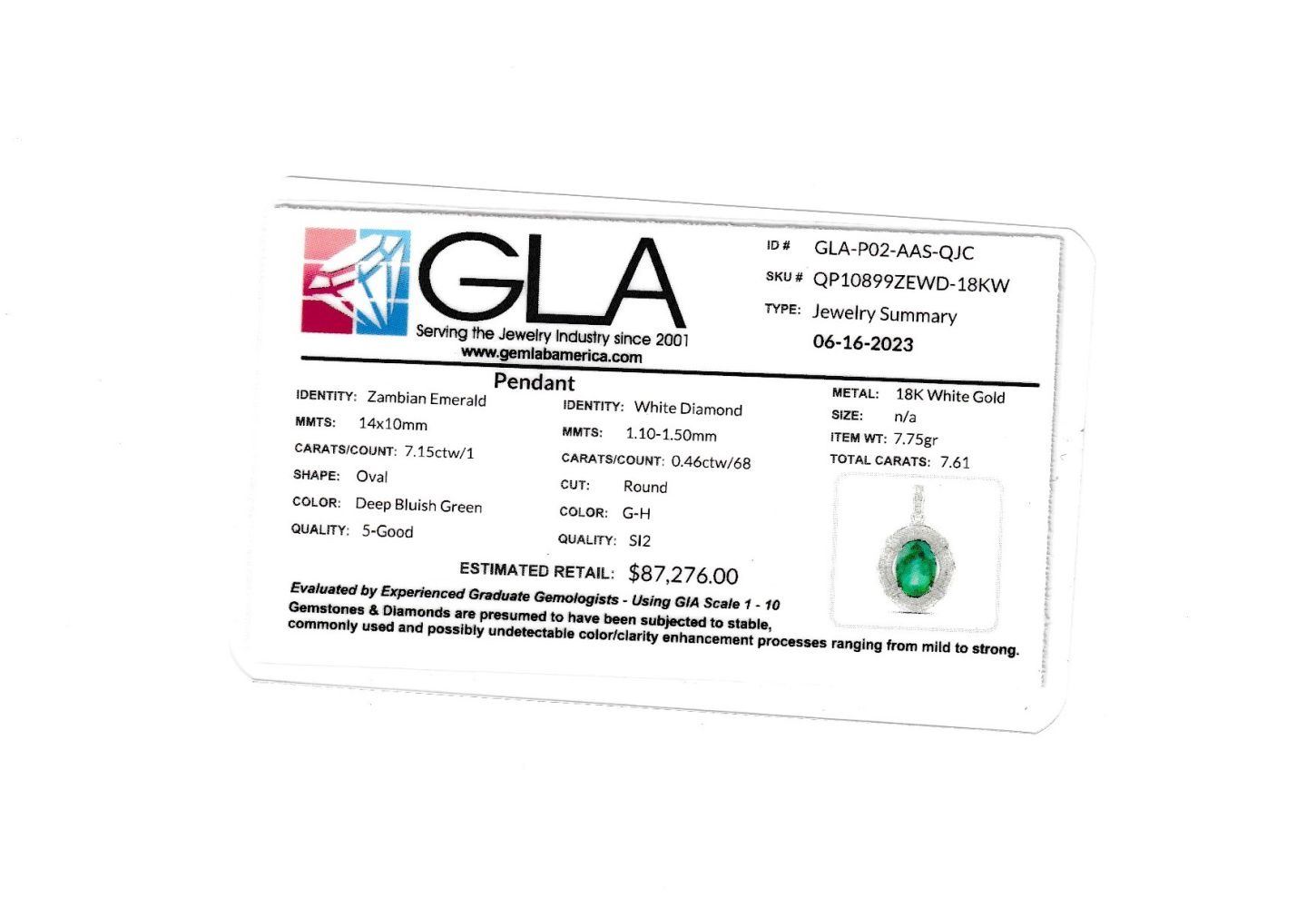 Genuine Emerald and Earth-Mined Diamond Pendant.& nbsp; Seriously stunning!& nbsp; The impressive 7.15 carat oval-cut Zambian emerald is prong-set in an 18 karat white gold pendant with .46 carats of round, brilliant-cut, G-H color SI2 clarity diamonds in the undulating frame and bail.& nbsp; The pendant is approximately 1.25& quot; long (including the solid bail attached to an affixed jump ring) and 3/4& quot; wide and 10 mm deep.& nbsp; The pendant has a supportive back gallery.& nbsp; This pendant is certified and appraised for $87,276.00 estimated retail replacement value.