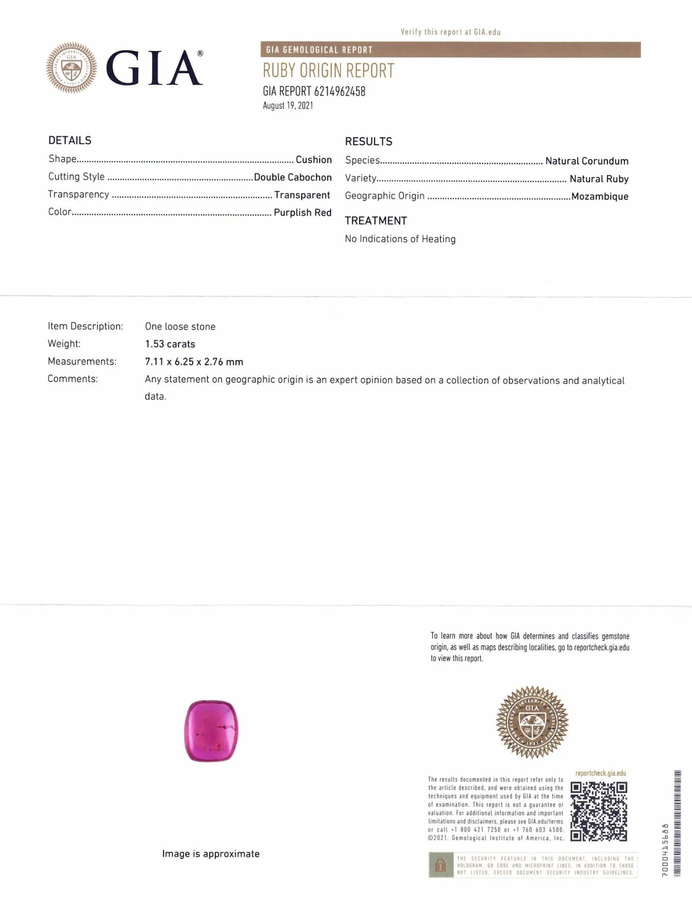 Stunning 1.53 Ct Purplish Red Ruby is a cushion double cabochon cut measuring 7.11 x 6.25 x 2.76 mm. The hue and tone on this Unheated Ruby is absolutely gorgeous! Origin: Mozambique. Treatment: None. Please see the certification for additional information.