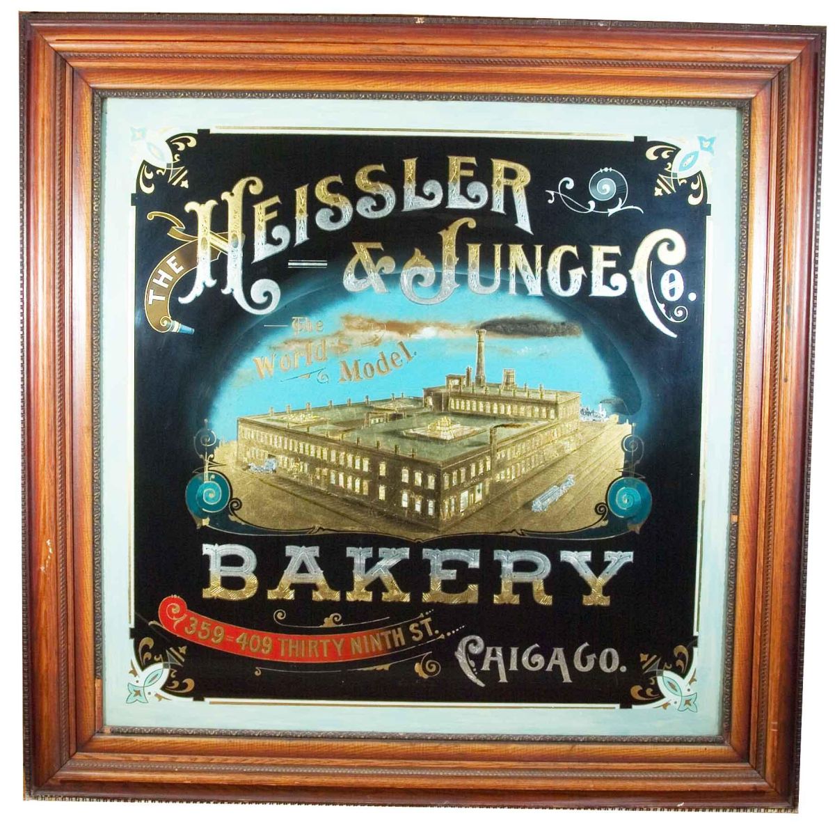 Heissler Junge Bakery Reverse Glass Sign. Depicting "The World's Model" Heissler Junge Bakery, 359-409 Thirty-ninth St. Chicago in 1889. Acid etching, gilding, silvering and mother of pearl, in original frame. Minor gold leaf lifting and slightly damaged spot on the frame. Very good original condition. 59 1/2 X 59 1/2 inches overall