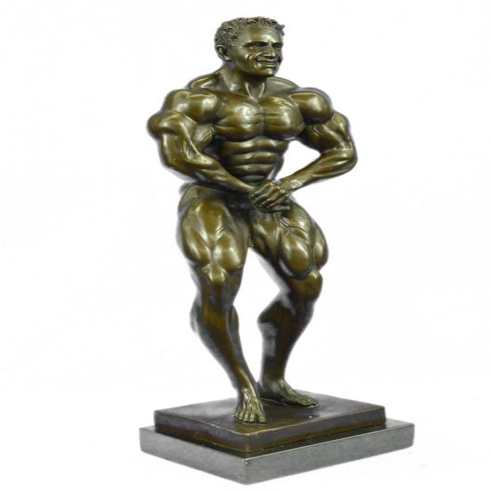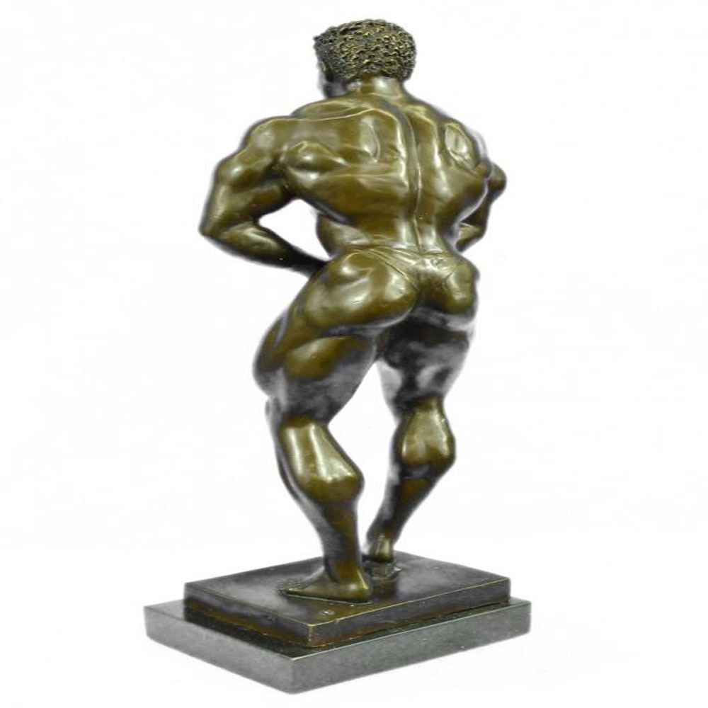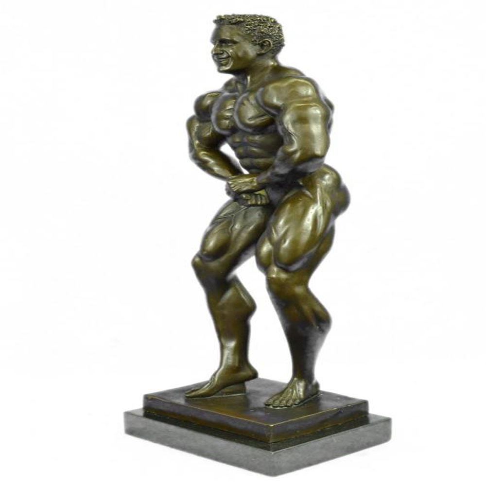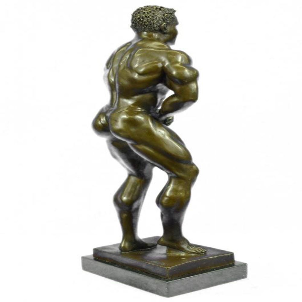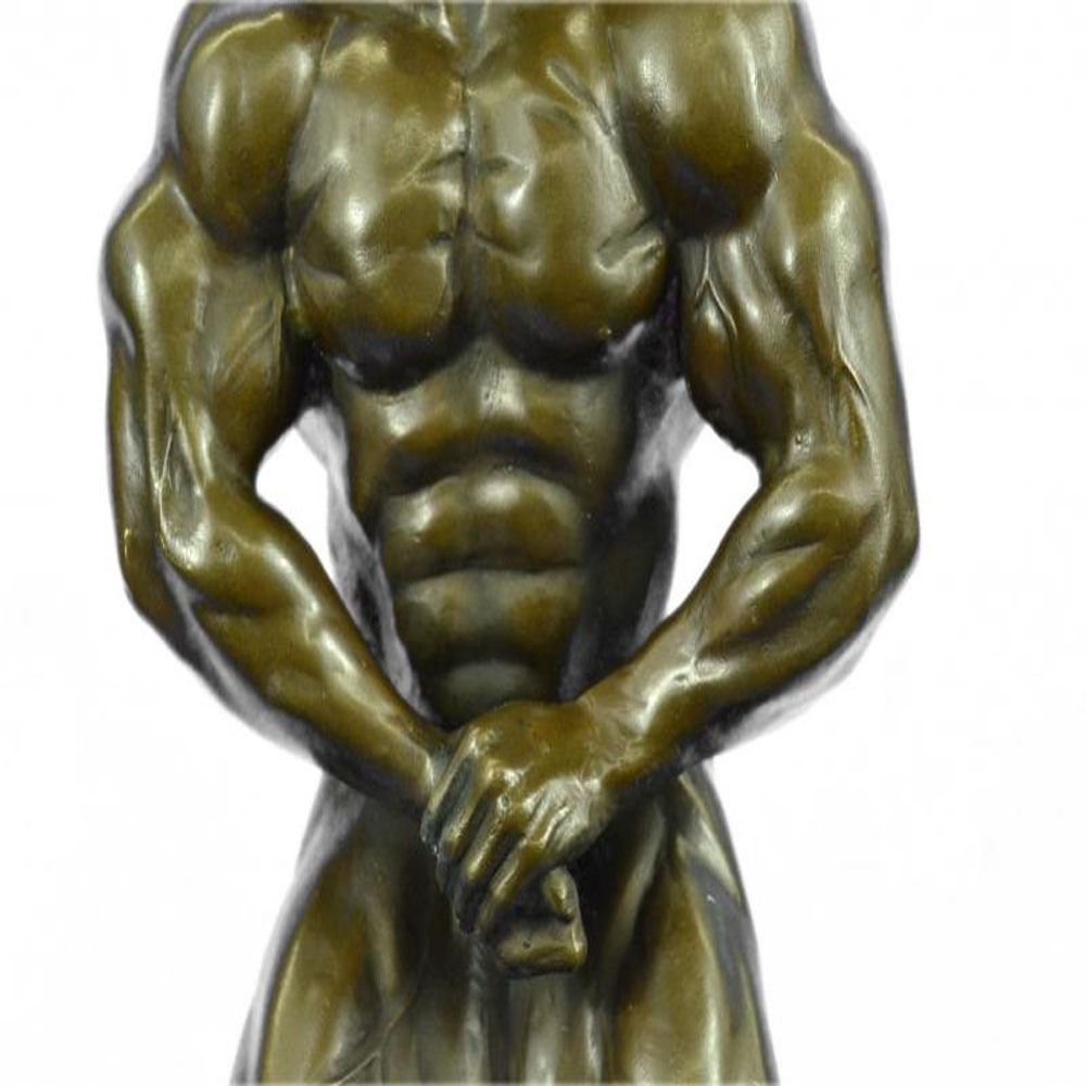 Bronze Iron man statue. An intricately crafted piece is of a strong man confidently placing his hands on his hips. Each curvature of his muscles is clearly defined. This man has dedicated countless hours to physical fitness. Athletes, iron men, and fitness buffs will enjoy this symbol of hard work. This piece was created using the lost wax method and set on a marble base. Dimensions: Height 19 X Width 7 inches. Weight: 15 LBS.