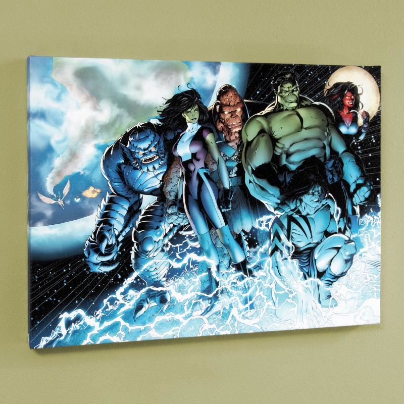 A piece of comic book history, this limited edition, from original art by Barry Kitson, depicting Hulk and She-Hulk. Barry Kitson got his start at Marvel UK by penciling Spider-Man, and now works on the Fantastic Four, Hulk, and Iron Man series. "Incredible Hulks #615" is a limited edition numbered giclee on stretched canvas by Barry Kitson presented by Marvel Comics. This piece comes gallery wrapped and ready to hang. Includes Certificate of Authenticity! Measures approx. 24" x 18" (image); 1.5" (depth).
