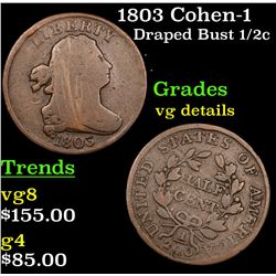 1803 Cohen-1 Draped Bust Half Cent 1/2c Grades vg details.