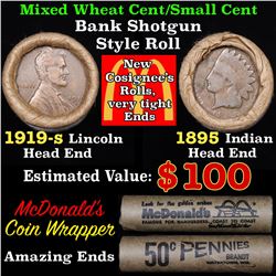 Mixed small cents 1c orig shotgun roll, 1919-s Wheat Cent, 1895 Indian Cent other end,McDnalds Wrapp