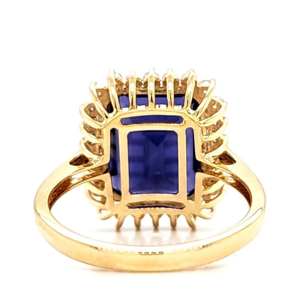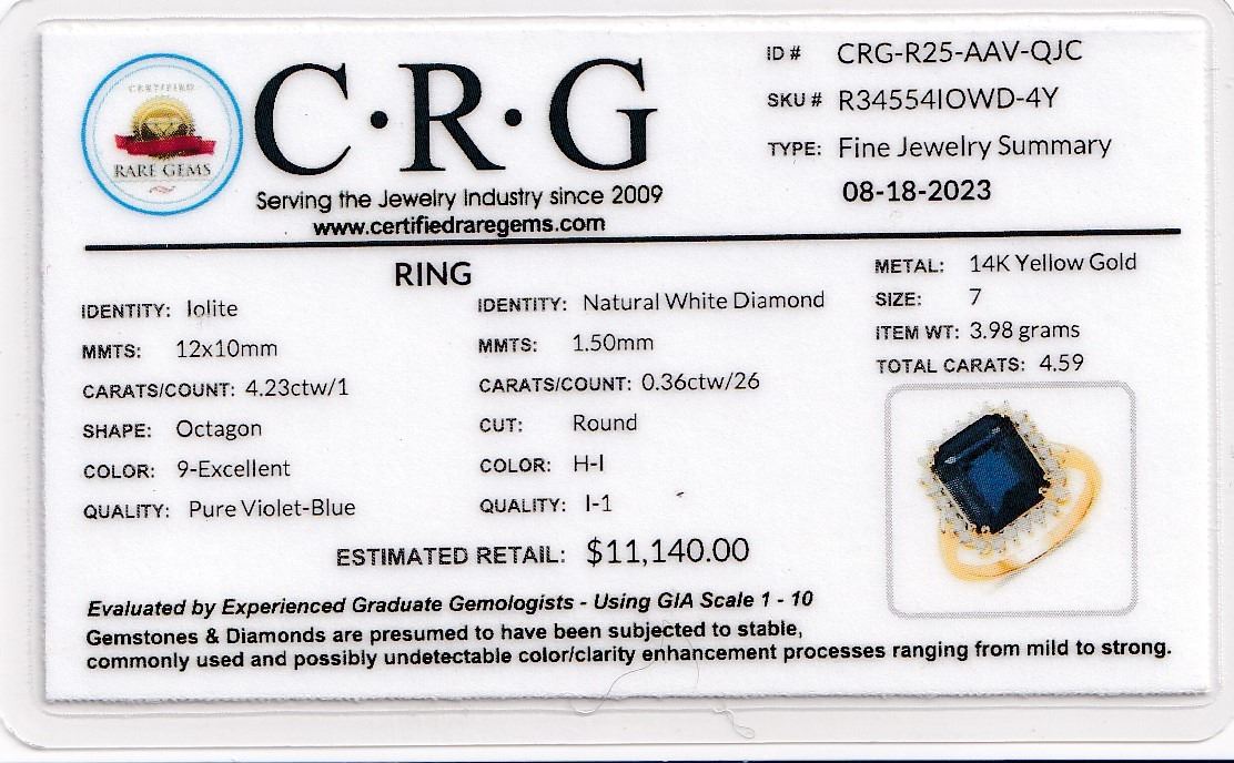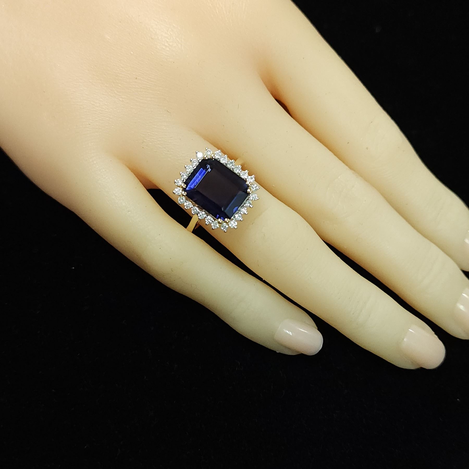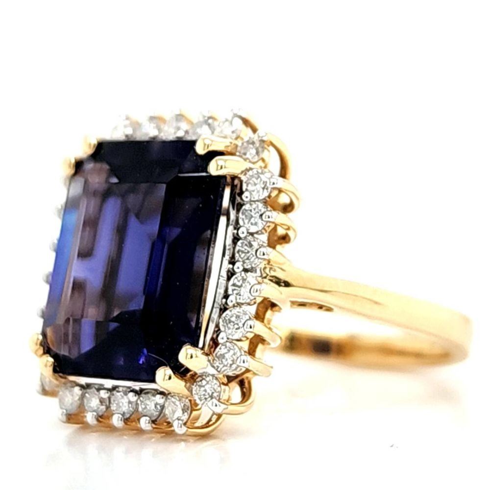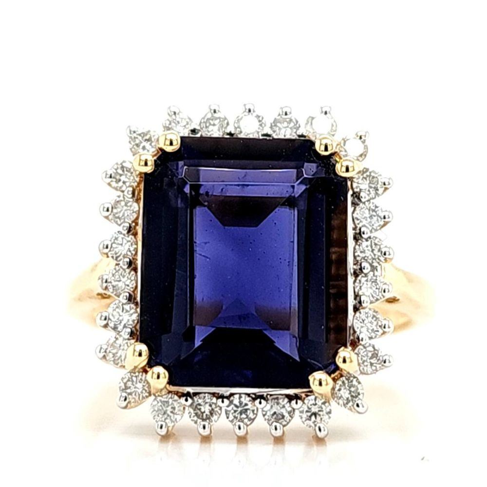 Genuine Iolite and Earth-Mined Diamond Ring.& nbsp; This ring is stunning.& nbsp; The rectangular shape and truncated corners are so very elegant!& nbsp; The 4.23 carat octagonal iolite is secured with double prongs inside a .36 carat round, brilliant-cut, H-I color, I1 clarity diamond halo.& nbsp; The ring is US size 7 with an approximate 2mm shank a supportive under gallery. This ring can be resized for an additional $100, please allow an additional 10 days for shipping if we resize it. This ring is certified and appraised for& nbsp; $11,140.00 estimated retail replacement value.