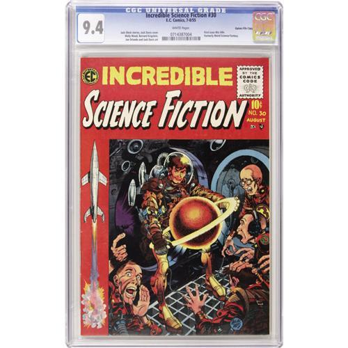 <B>Incredible Science Fiction #30 Gaines File pedigree 2/12 (EC, 1955) CGC NM 9.4 White pages.</B></I> Here's another Gaines File Copy, this one surpassed in grade by only one other copy, according to the latest CGC census data. This was the first issue of the title, continuing the numbering from <B>Weird Science-Fantasy</B></I>. Jack Davis, Joe Orlando, Bernie Krigstein, and Wally Wood art. Overstreet 2006 NM- 9.2 value = $585. CGC census 10/06: 3 in 9.4, 1 higher.<BR><BR><b>Shipping:</b> Slabbed Comic (<a target="_blank" href="http://www.heritageauctions.com/common/shipping.php">view shipping information</a>)