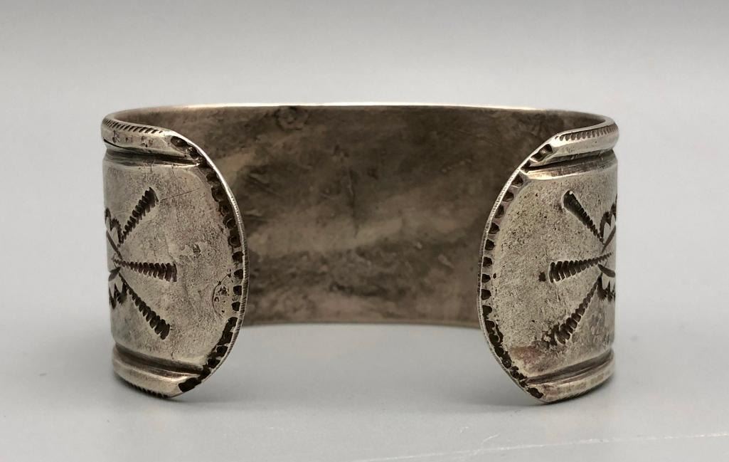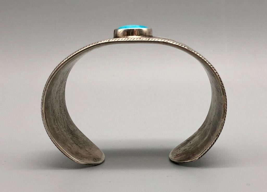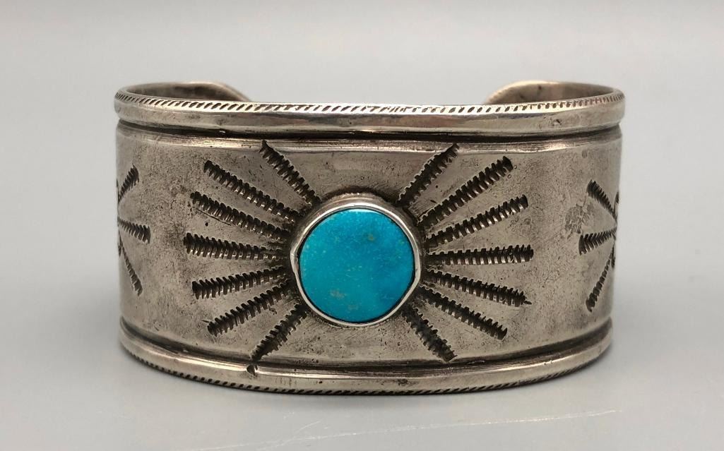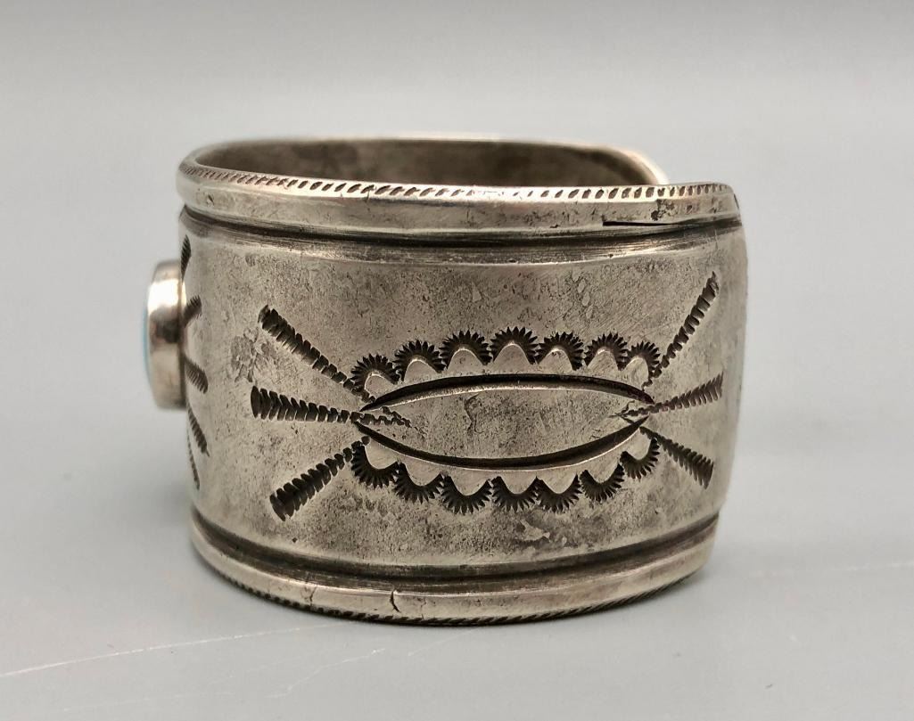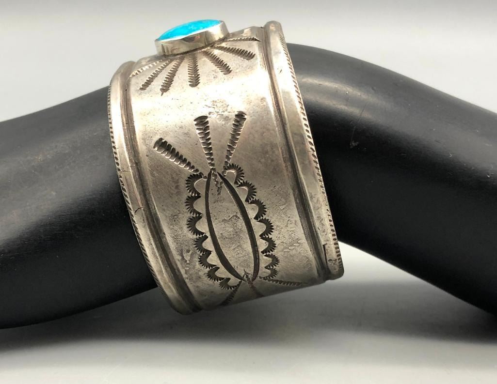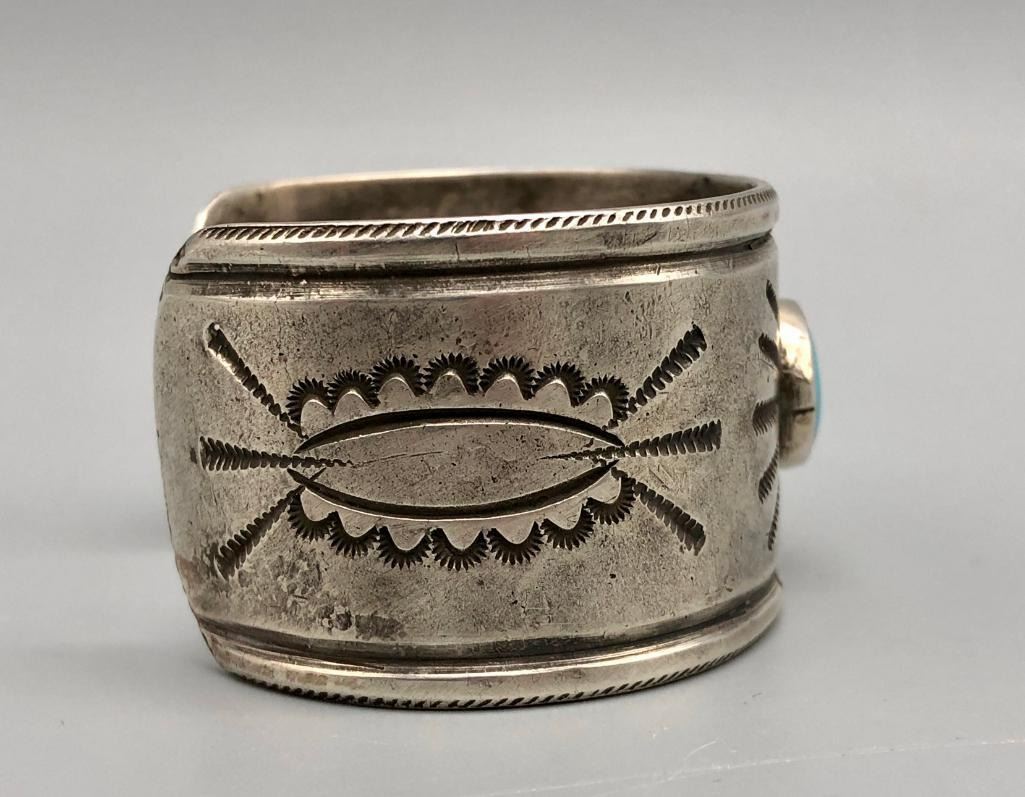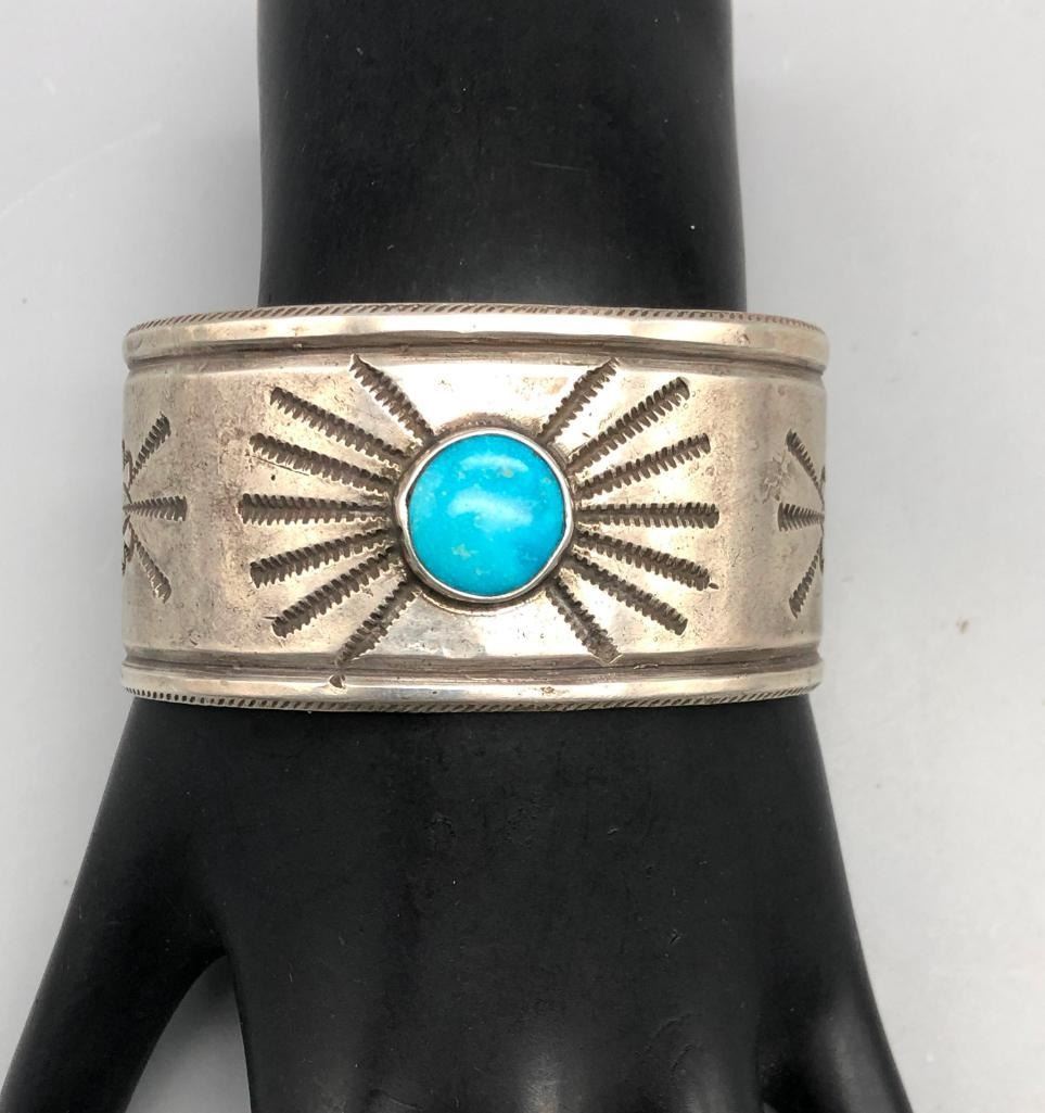 For sale in this lot is an incredible vintage bracelet. This is a stunning ingot bracelet with hand stamped designs accenting a nice turquoise stone. This bracelet has a great weighted feel to it and is made from sterling silver. MAKER: Unmarked. APPROX AGE: Circa 1940s-1950s. SIZE: Inside circumference measures 5-3/4 inches long. Opening is an additional 1 inch, fitting a 6-3/4 inch wrist. Width is 1-3/8 inches. Weighs 96.8 grams. CONDITION: Good for its age, normal wear expected. Please look closely at the pictures as they are an important part of our description and are hereby incorporated into the description, specifically with regards to condition. SHIPPING: There will be a $5 handling / packaging fee for shipping this lot. The actual cost of postage will be added on top of that. BUY IT NOW: If you would like to buy this item now, without waiting for the auction day to bid on it, we do offer this option (which is available up to 48 hours before the actual auction starts). The “Buy it Now” price is the high estimate of this lot (plus applicable fees and the Buyer's premium is discounted to 10% when using the Buy it Now option). If you would like to exercise this option, you must contact us by email (or phone as long as you talk to someone live). Reference this lot number and your intention to "Buy it Now."