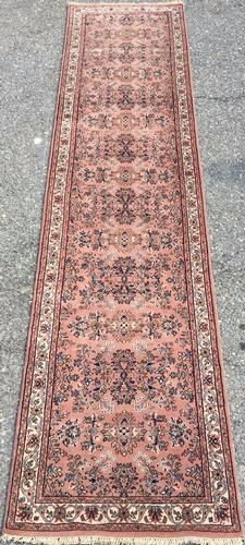Incredibly Intricate High Quality Persian-Pak Sarouk Runner. 100%Natural, hand woven, vegetable dye, baby lamb's wool pile on cotton foundation. It is rather rare to come across a Sarouk design runners in the marketplace. This is a remarkable piece with a captivating highly intricate all-over floral Sarouk design on a soft dusty rose color background. Superior quality baby lamb's wool, spirited uncompromising workmanship, sublime color palette and durable construction has made Sarouk the rug of choice for many centuries. this lovely runner has a fairly lush pile. Size: 10 feet 2 inches X 2 feet 6 inches. Country of Origin: Pakistan.
