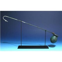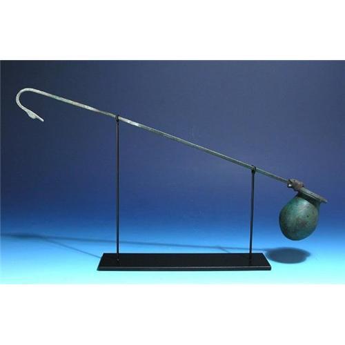 They don't come much rarer or finer than this! Ancient Greek Bronze Dipper used to dip precious oils, probably by athletes in the gymnasium. Dating to the 5th to 4th centuries B.C., features a sack-shaped vessel held in place by a lion-headed terminal, other end with goose-headed handle and small thumb impression about 1/3 down the rectangular handle. 18-1/4"L x 3"W, in choice condition with a stunning deep-green patina. Interestingly, the patina is very different below where a hand would be placed (indicating it was almost certainly dipped into an oily substance). Ex-private Colorado Collection. For a somewhat similar vessel, see Christie's December 7, 2005, for a Roman example that realized just over $7,000 - that piece is now offered in a Swiss Gallery for 20,000 Swiss Francs (about $15,000). Will be custom-mounted for no extra charge when purchased. Stunningly rare!