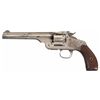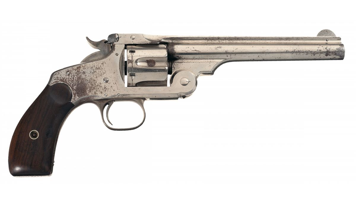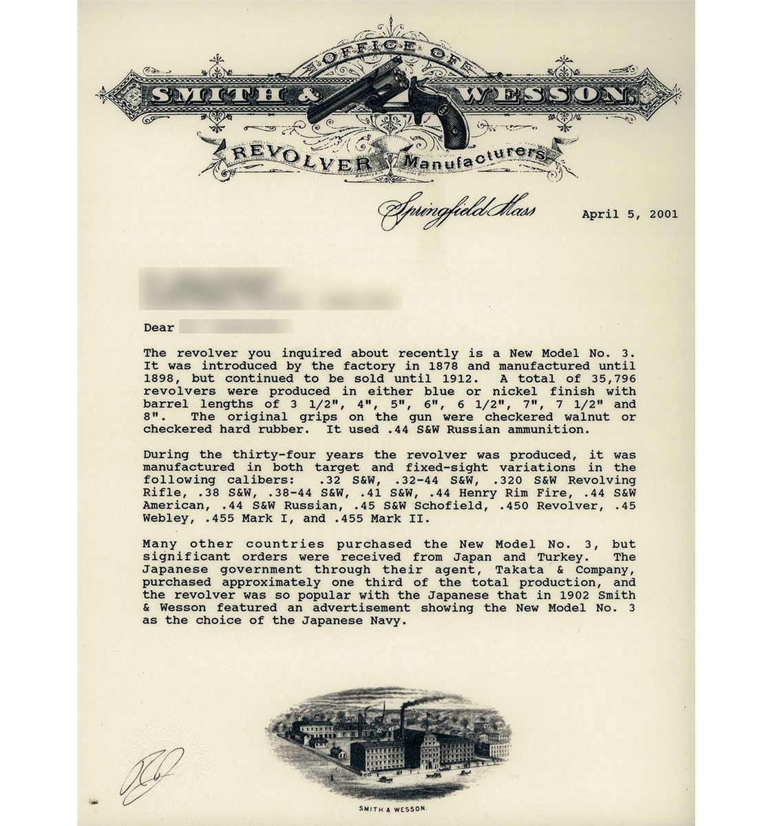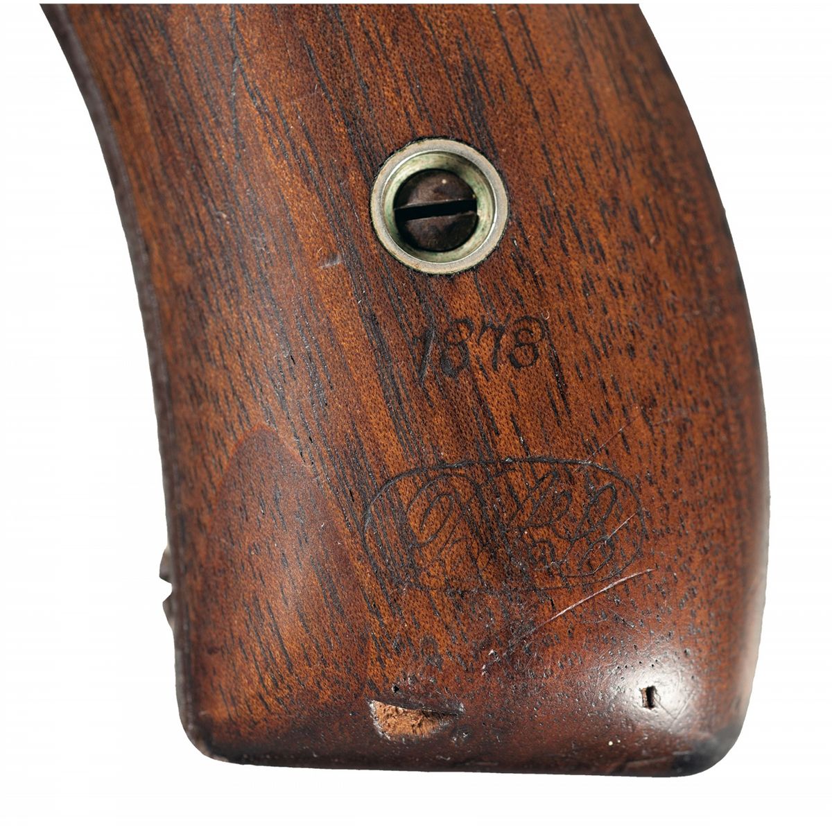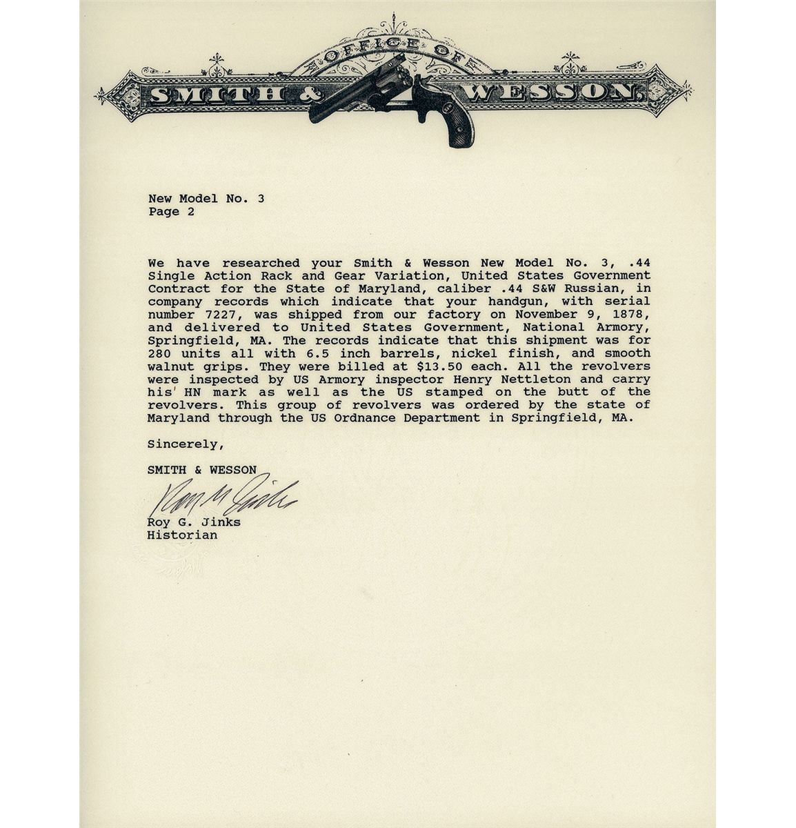Manufactured in 1878, the first year of production for the New Model 3 and has the early rack and gear extractor. This revolver is one of 280 inspected by U.S. Inspector Henry Nettleton that were shipped to the U.S. Government National Armory in Springfield, Ma, that were ordered by the State of Maryland Through the U.S. Ordnance Department. The top of the barrel rib is marked with the two line address/patent dates, The heel of the butt is marked "US", and the frame under the cylinder, rear cylinder face and bottom of the barrel lug are marked "HN". The matching serial number is marked on the butt, rear cylinder face, barrel latch and barrel. Blade front and notch rear sights, nickel finish with casehardened hammer and trigger guard and fitted with smooth walnut grips with "1878" over a "DAL" cartouche on the left panel and a "HN" cartouche and matching serial number stamped on the inside of the right panel. The accompanying factory letter verifies the rack and gear variation, 6 1/2 inch barrel, 44 S&W Russian caliber, nickel finish and smooth walnut grips. The letter also verifies the shipment of 280 units ordered by the State of Maryland through the U.S. Government and delivery to the National Armory at Springfield, Ma.
