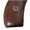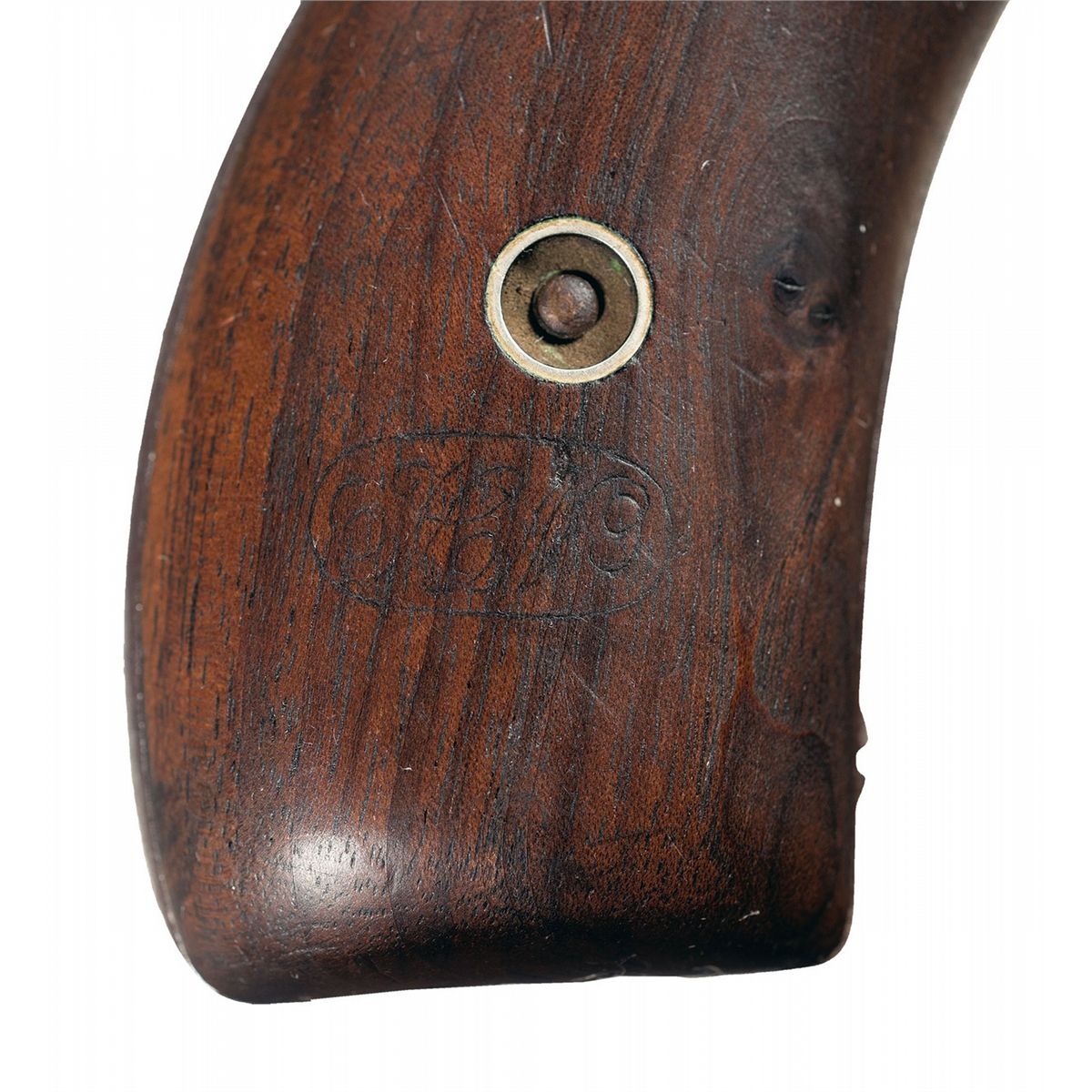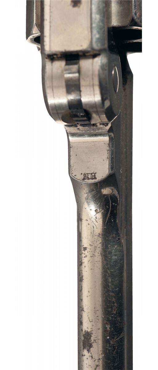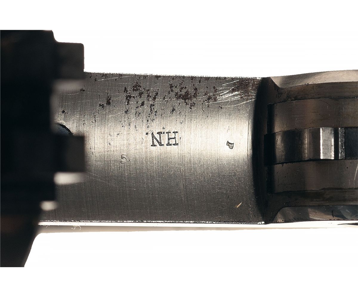 Condition: Very fine. The revolver retains 80% original nickel finish with scattered minor flaking, a few minor dings on the butt and some wear and minor pitting on the barrel. The hammer retains 50% muted original case colors and the trigger guard has a smooth gray patina with strong traces of original case colors in protected areas. The grips are fine with a small gouge on the lower left panel, a few dings on the bottoms, a few light scratches and a pleasant hand rubbed patina. The markings are sharp. The action is excellent. A nice example of a scarce U.S. Henry Nettleton inspected Maryland contract New Model 3 revolver.