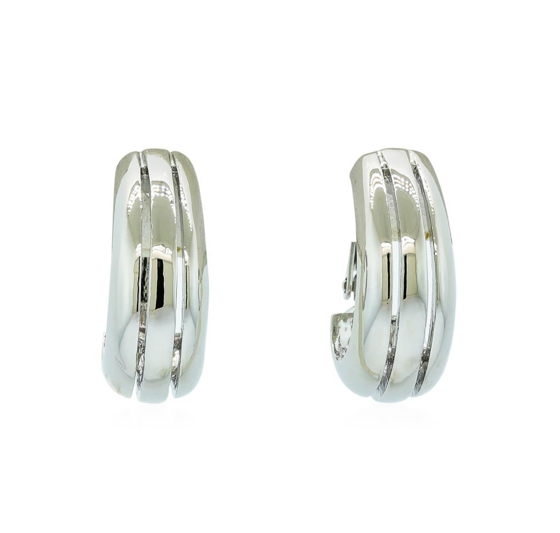 High end designer jewelry. Indent Design Hoop Earrings - Rhodium Plated. Rhodium Plated Lever Clasp. Silver. 1inch.