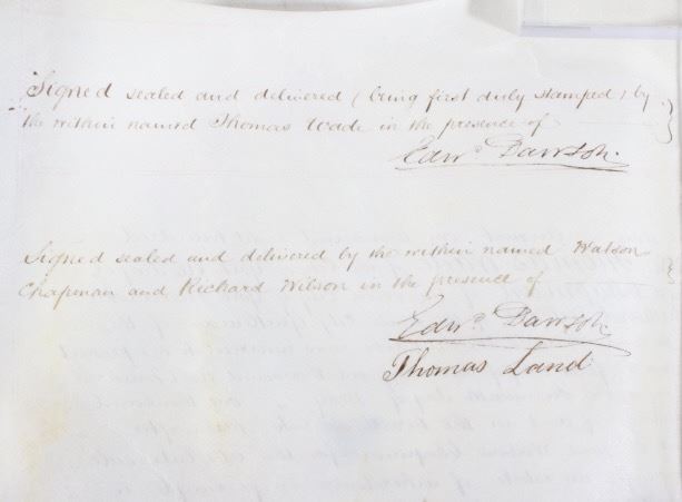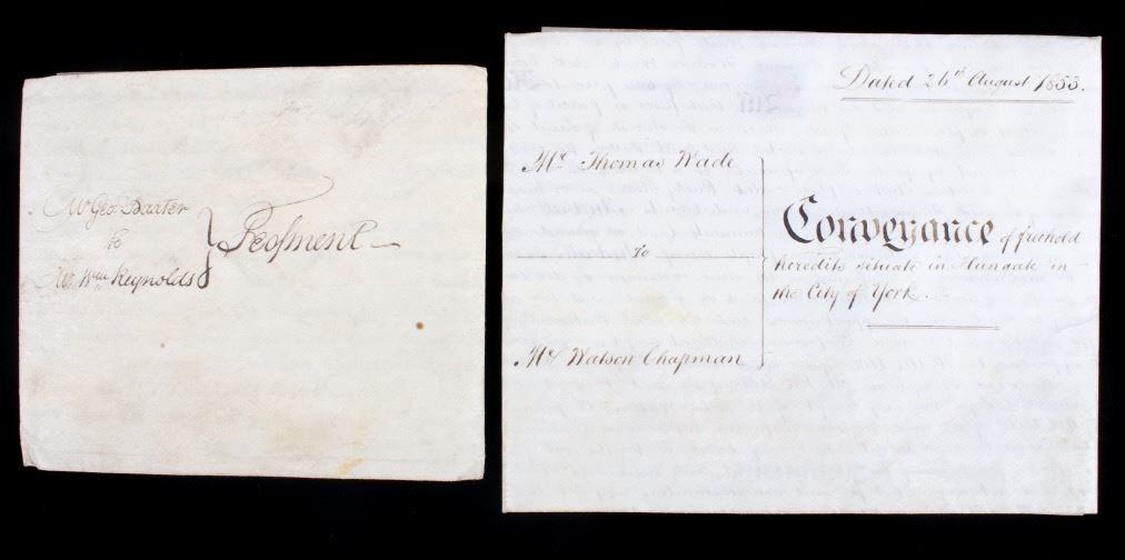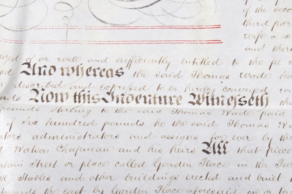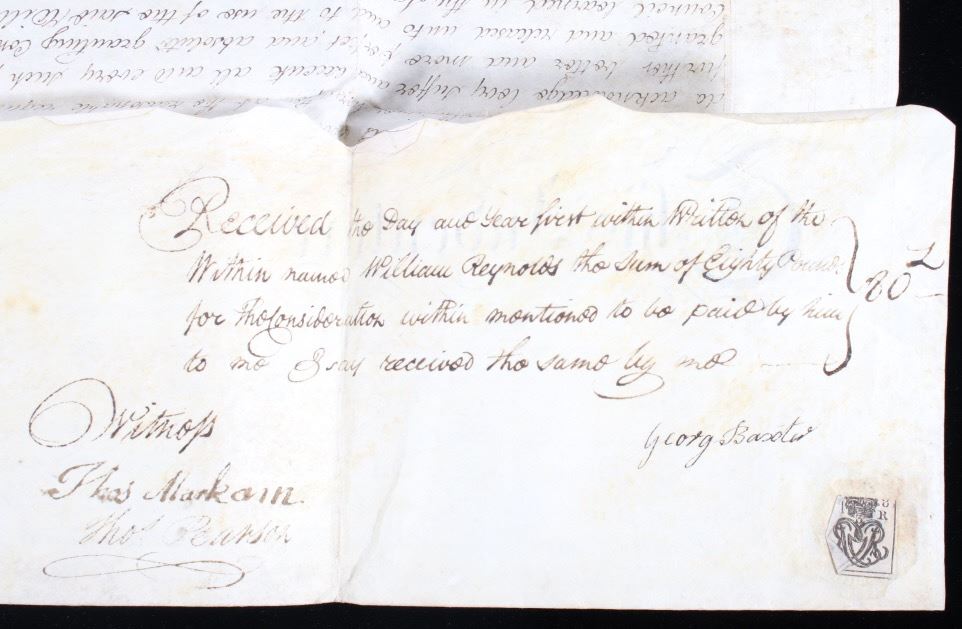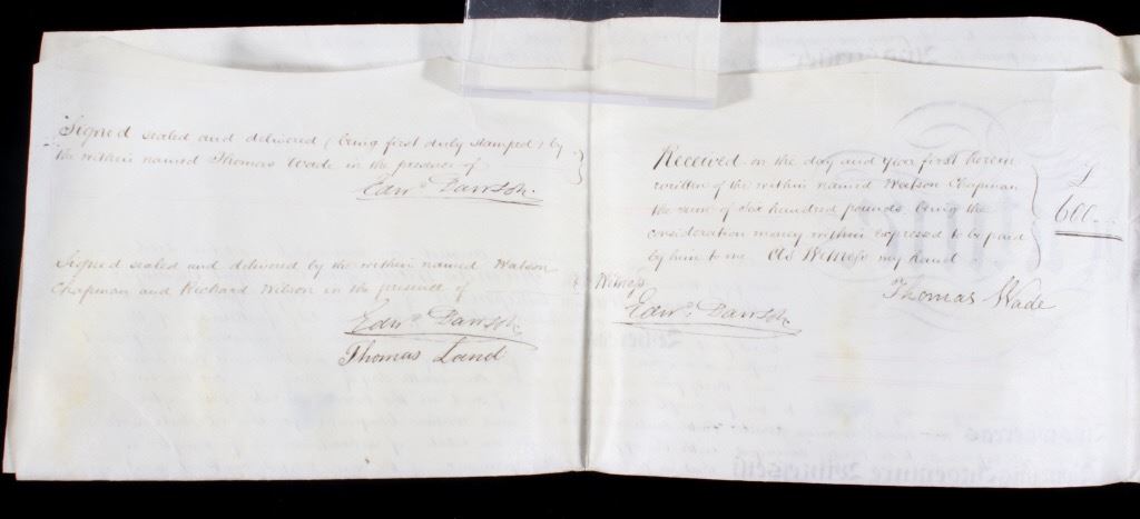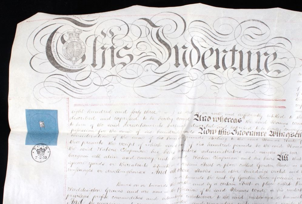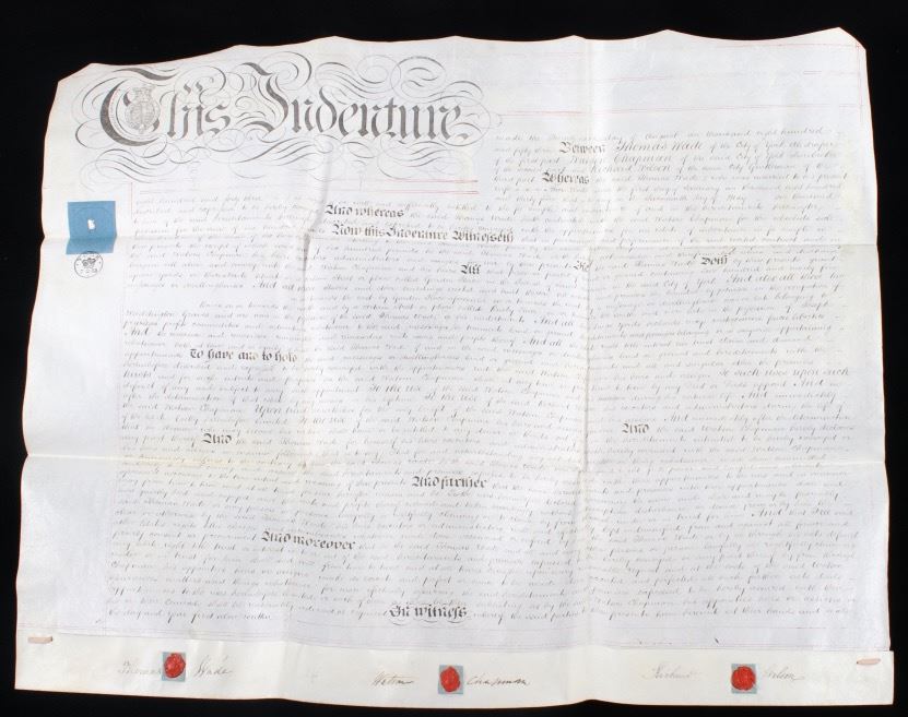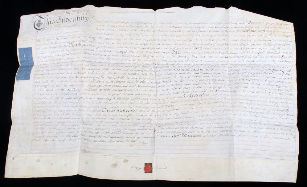 Included in this lot we have a pair of Indenture papers made of sheep skin both originating from 1853. The papers show beautiful script in a flowing hand written lettering. Both of the indenture papers are dated in mid to late 1853. The documents are signed across the bottom with wax seals and signatures. The papers are in good condition overall with some wear indicative of age. The pieces measure 26 1/4" wide by 20 3/4" tall.