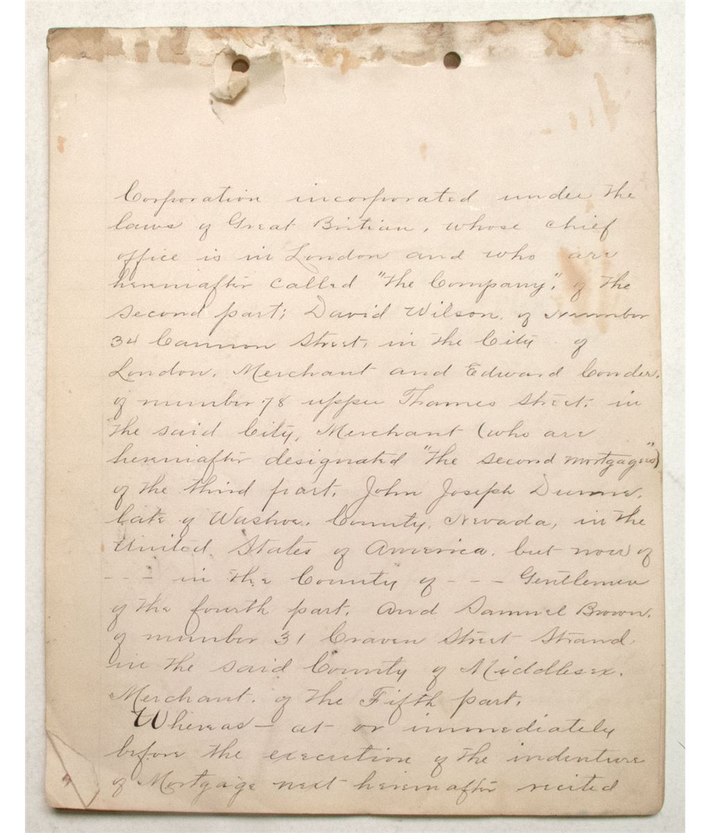 DATED 1870: This Indenture was written and incorporated in England. It was officially recorded in the book of Mortgages, at Washoe County, Nevada. It has information on the exact location of the company's holdings and all entries are dated between 1870-1875, it was for their first and second Mortgages. The Company name was-Nevada Land and Mining Company, it has 27 hand written pages.