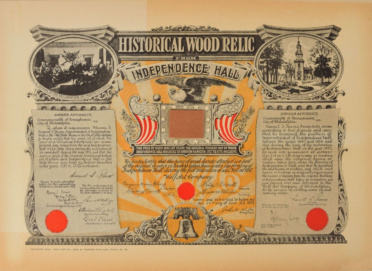Fragment of wood from Philadelphia's Independence Hall, 1.25 x 1, affixed to an attractive presentation certificate produced by the Wolf Art Co. in 1926, reading, in part: "Historical Wood Relic from Independence Hall. This piece of wood was cut from the original timbers out of which Independence Hall was built by Andrew Hamilton, 1732 to 1735 inclusive." The timber was recovered from the flooring of Independence Hall by Samuel Reeves during its 1897 restoration. In fine condition, with blocks of toning to certificate.