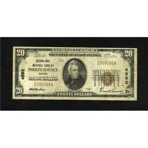 <B>Independence, KS</B></I> - $20 1929 Ty. 1 <B>Citizens-First NB</B></I> Ch. # 4592<BR>Officers R.W. Cates and Ernest Sewell placed this bank in voluntary liquidation on April 9, 1934. Several pinholes are noticed on this average circulated <B>Fine.</B></I><BR><BR><b>Shipping:</b> Coins & Currency (<a target="_blank" href="http://www.heritageauctions.com/common/shipping.php">view shipping information</a>)